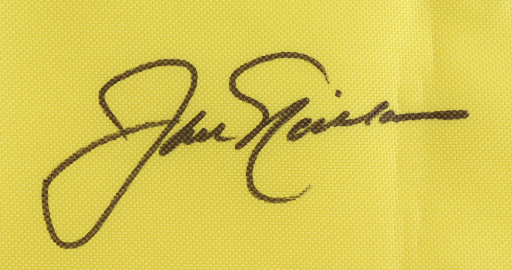 Pin flag measures approximately 13.5" x 18" in size and has been hand-signed by Jack Nicklaus (HOF).