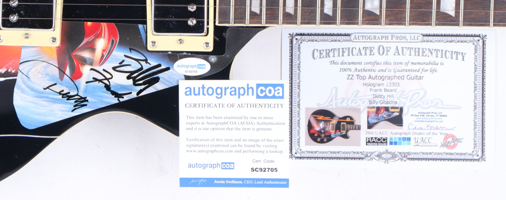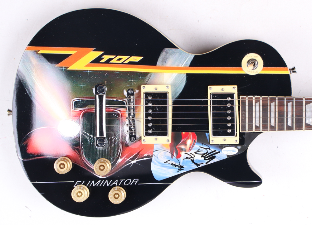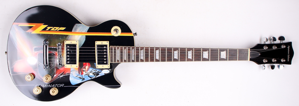 Signature Edition custom electric guitar measures 40" in length. Hand-signed on a cut that has been repurposed as a pick-guard by Dusty Hill (D. 2021), Billy Gibbons and Frank Beard.