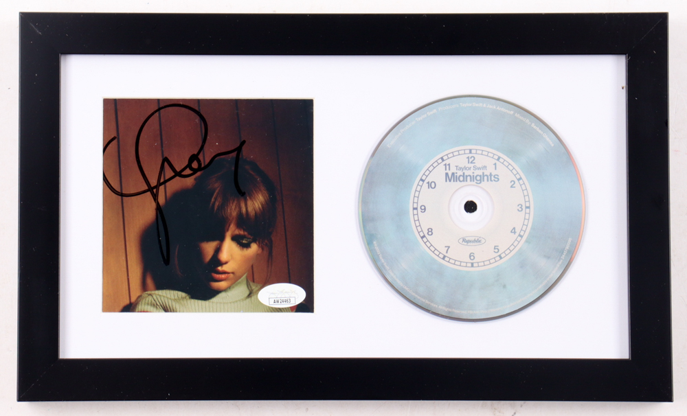 Custom frame measures approximately 8" x 13.5" in size. Features a "Midnights" CD album insert that has been hand-signed by Taylor Swift. The CD disc is included as shown.