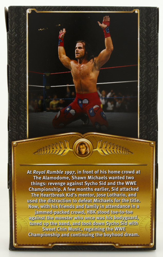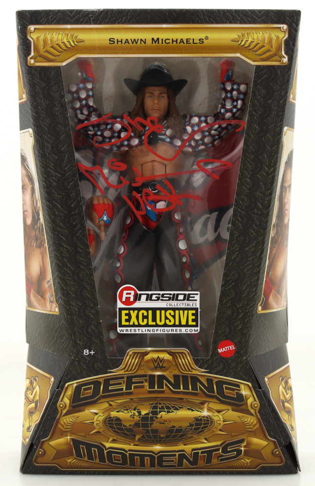 WWE Defining Moments Collection Series Ringside Collectible Exclusive action figure. Hand-signed and inscribed on the front of the packaging by Shawn Michaels (HOF). Please note, there is creasing on the original packaging.