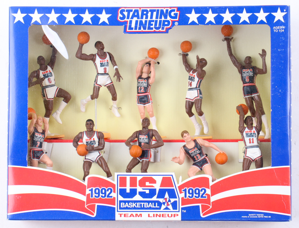 1992 Starting Lineup Team "Dream Team" USA Basketball Players Action Figure Set. See photos for more details on the box sets condition. Please note, the figure set is unsigned and there are creases, wear, and scuffing throughout the packaging.