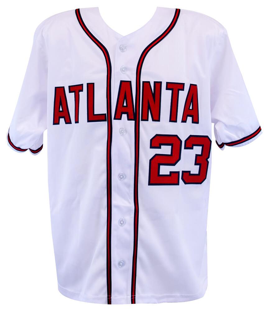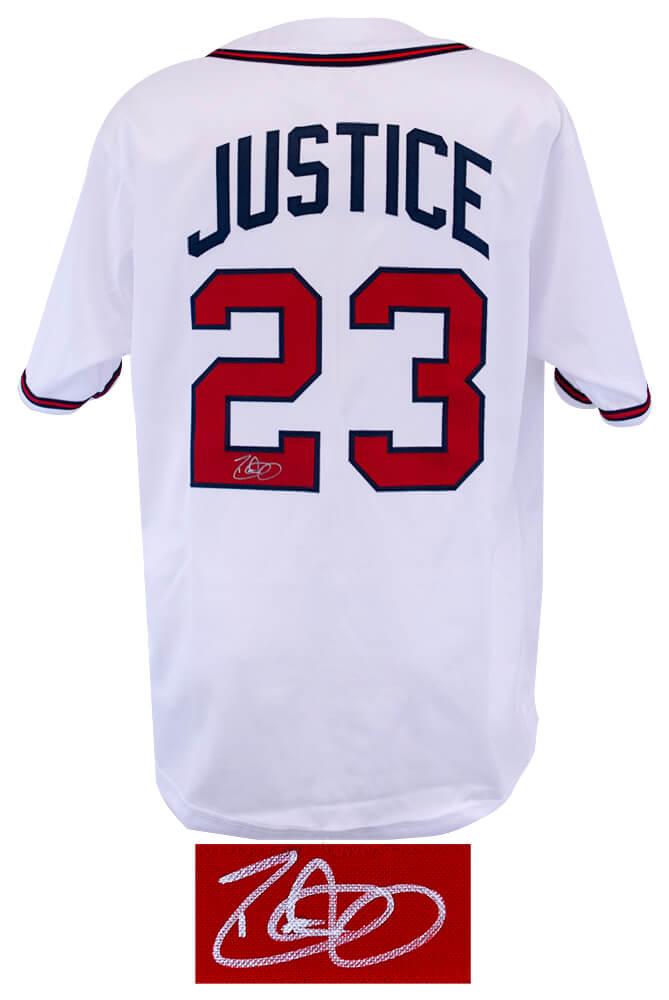 Custom style jersey with everything sewn on, size XL. Hand-signed by David Justice.