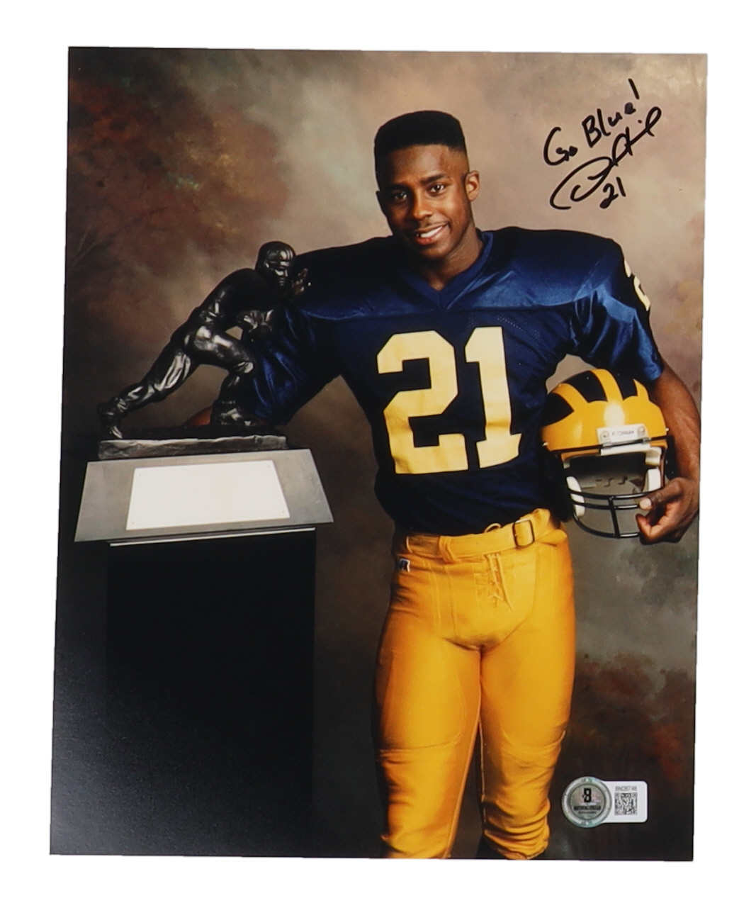 Photo measures 8" x 10" in size and has been hand-signed and inscribed by Desmond Howard (HOF). Please note, a personalization has been removed.
