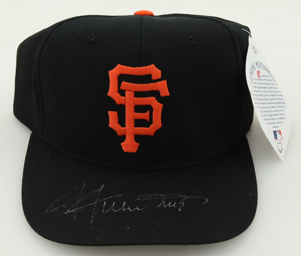 San Francisco Giants snapback adjustable hat has been hand-signed by Willie Mays (D. 2024, HOF).