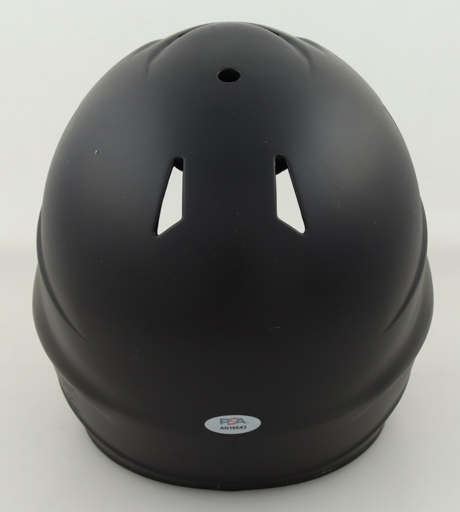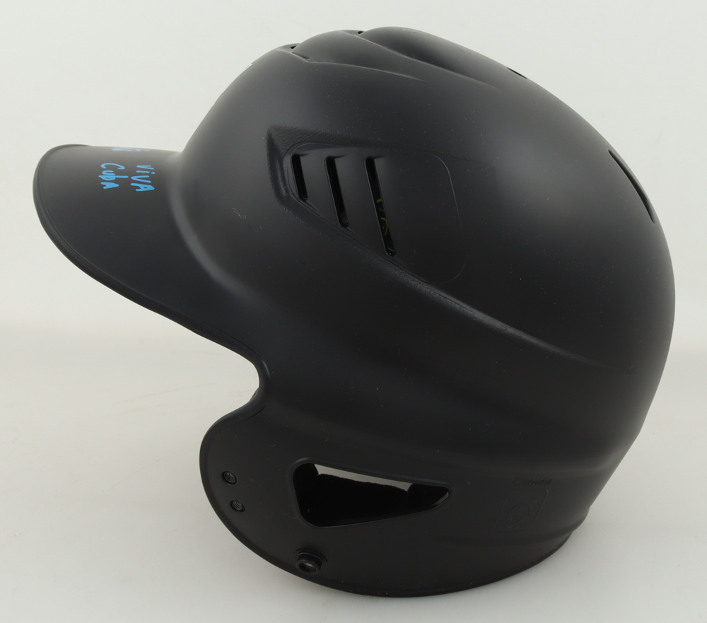 Rawlings full-size replica baseball helmet. Hand-signed and inscribed by Lazaro Montes.