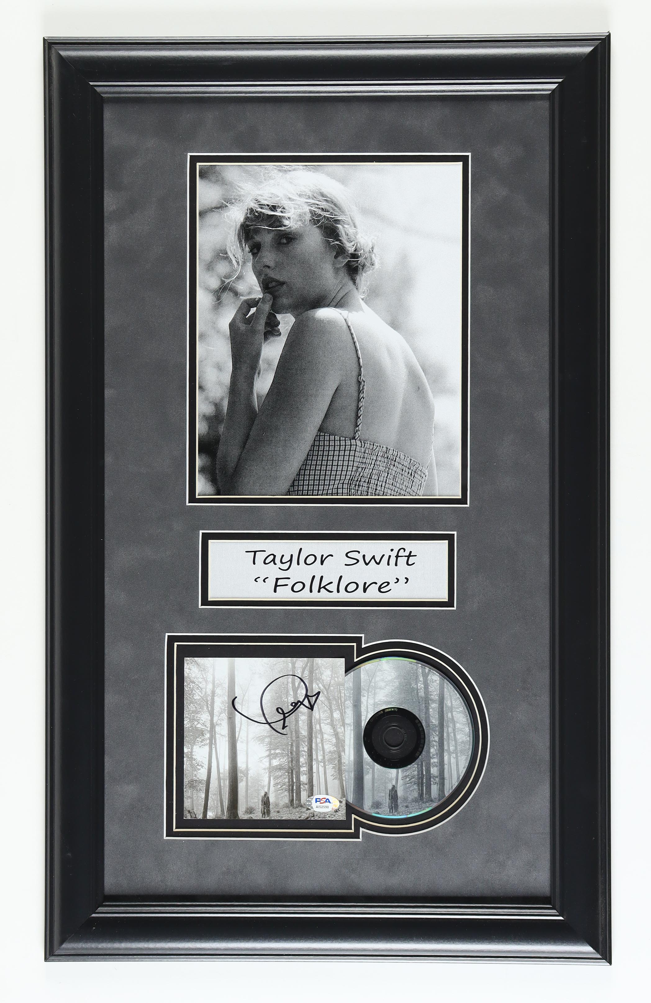 Custom frame measures approximately 16.5" x 27" in size. Features a "Folklore" CD insert that has been hand-signed by Taylor Swift. Includes disc as shown.