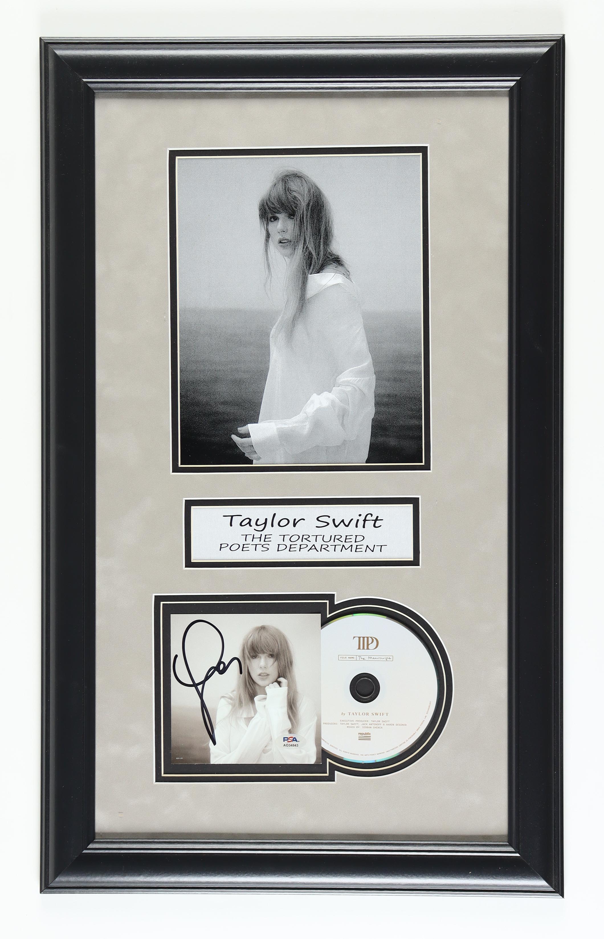 Custom frame measures approximately 16.5" x 27" in size. Features a "The Tortured Poets Department" CD insert that has been hand-signed by Taylor Swift. Includes disc as shown.