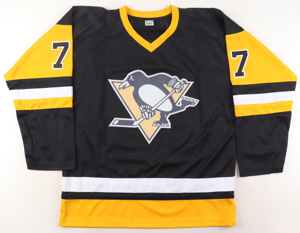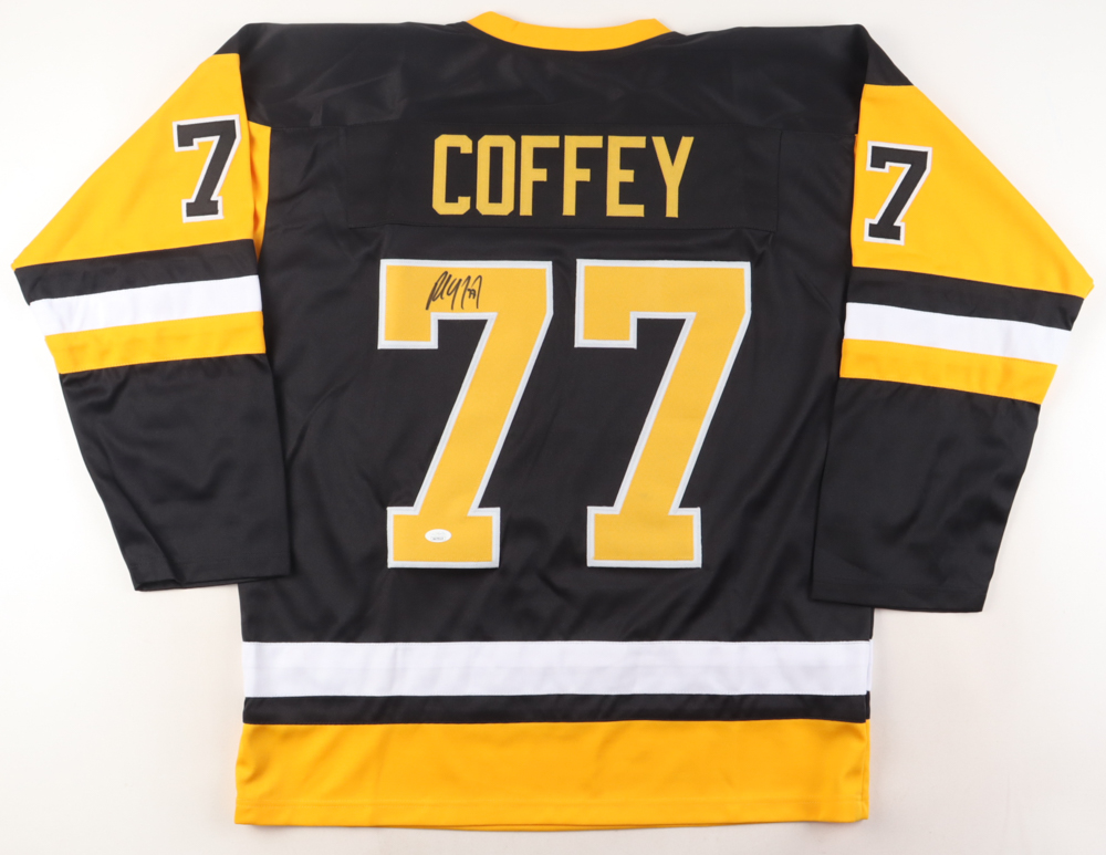 Custom style jersey with everything sewn on, size XL. Hand-signed by Paul Coffey (HOF).