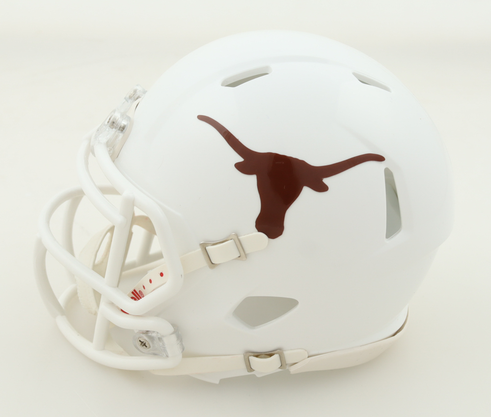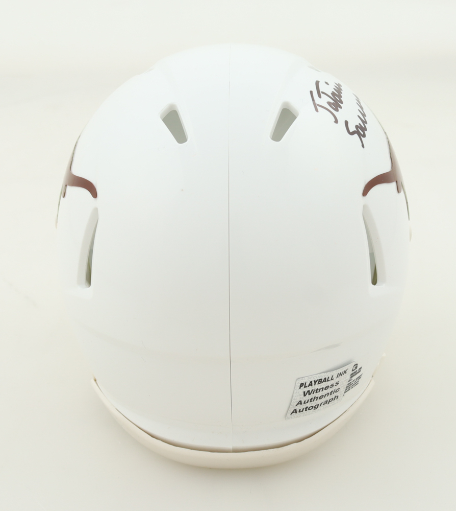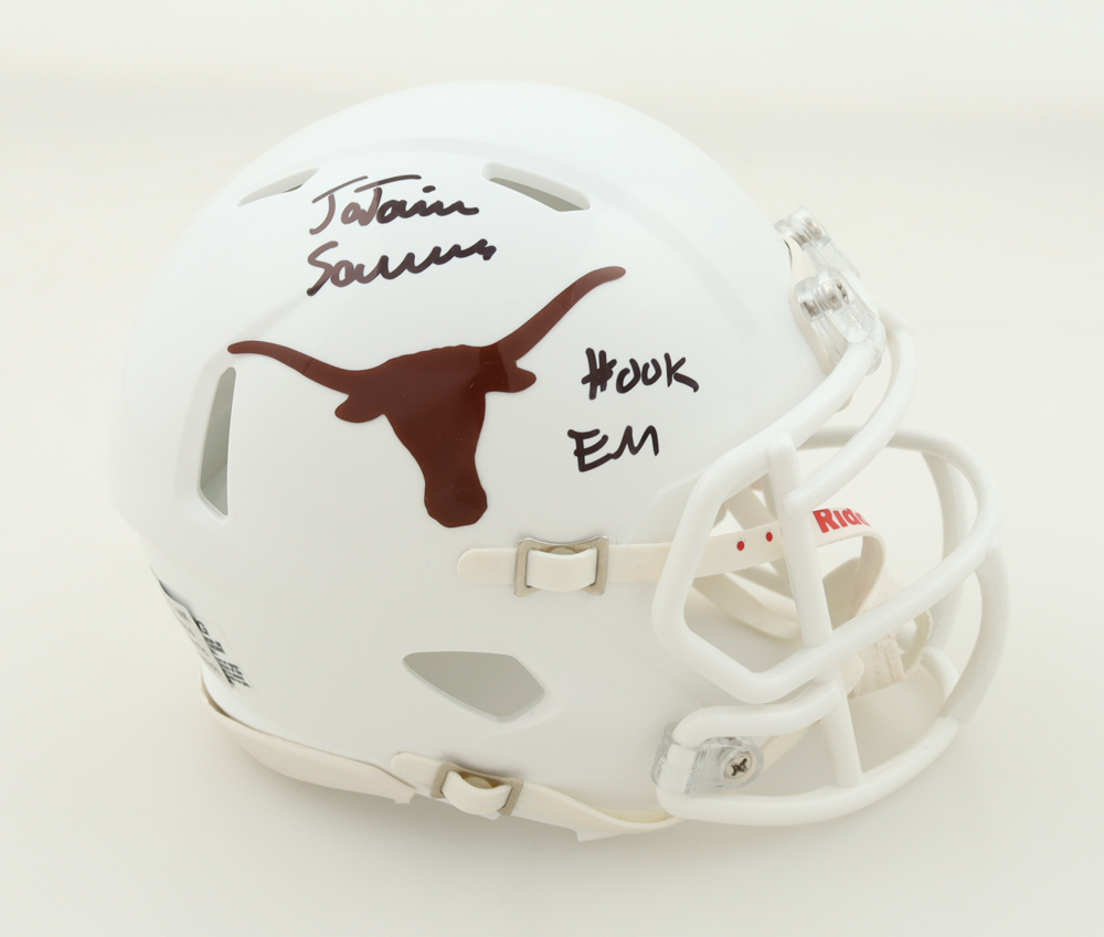 Riddell Texas Longhorns Speed Mini Helmet has been hand-signed and inscribed by Ja'Tavion Sanders.