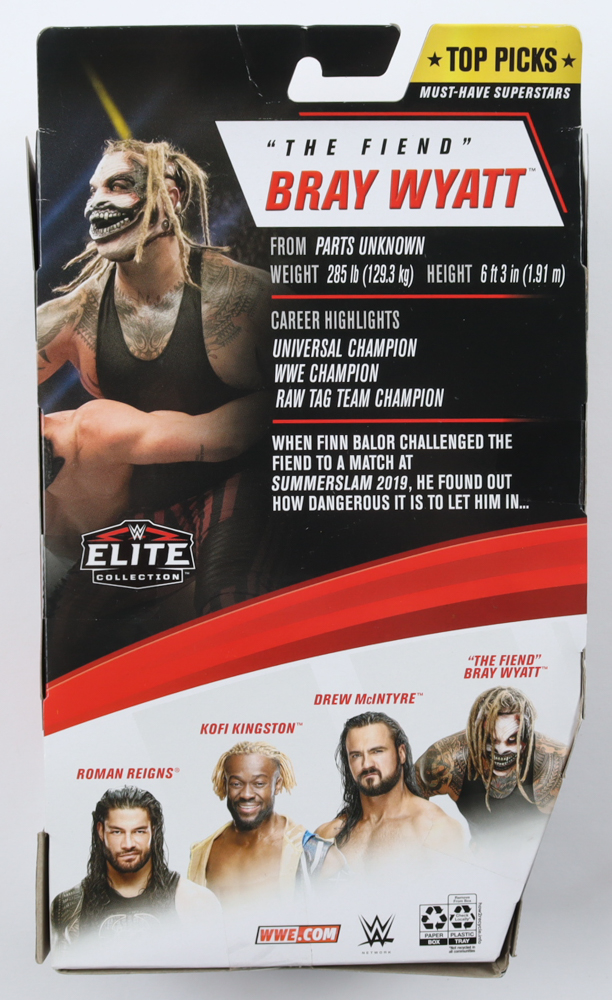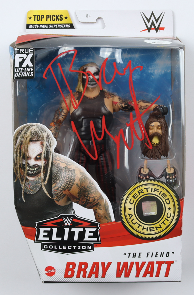 Mattel WWE Series 114 action figure. Hand-signed on the original packaging by Bray Wyatt (D. 2023). Please note there are bends to the packaging.