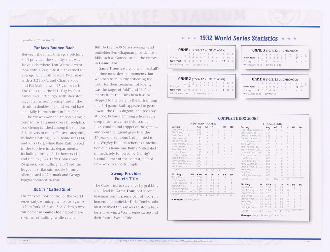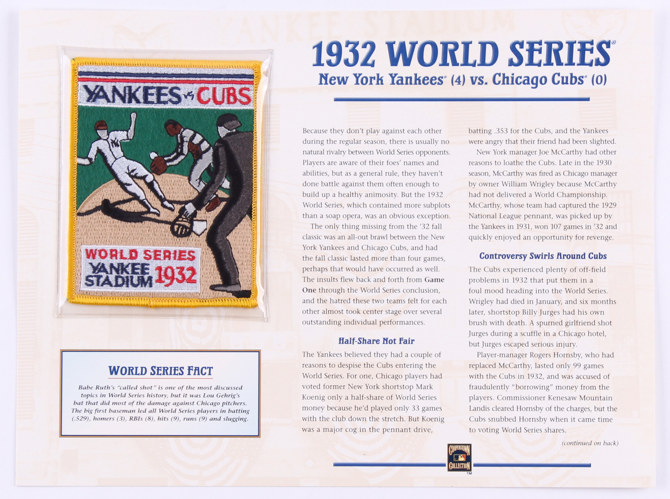 Official Cooperstown Collection 1932 World Series Patch Card with 9" x 12" Scorecard: Yankees vs Cubs