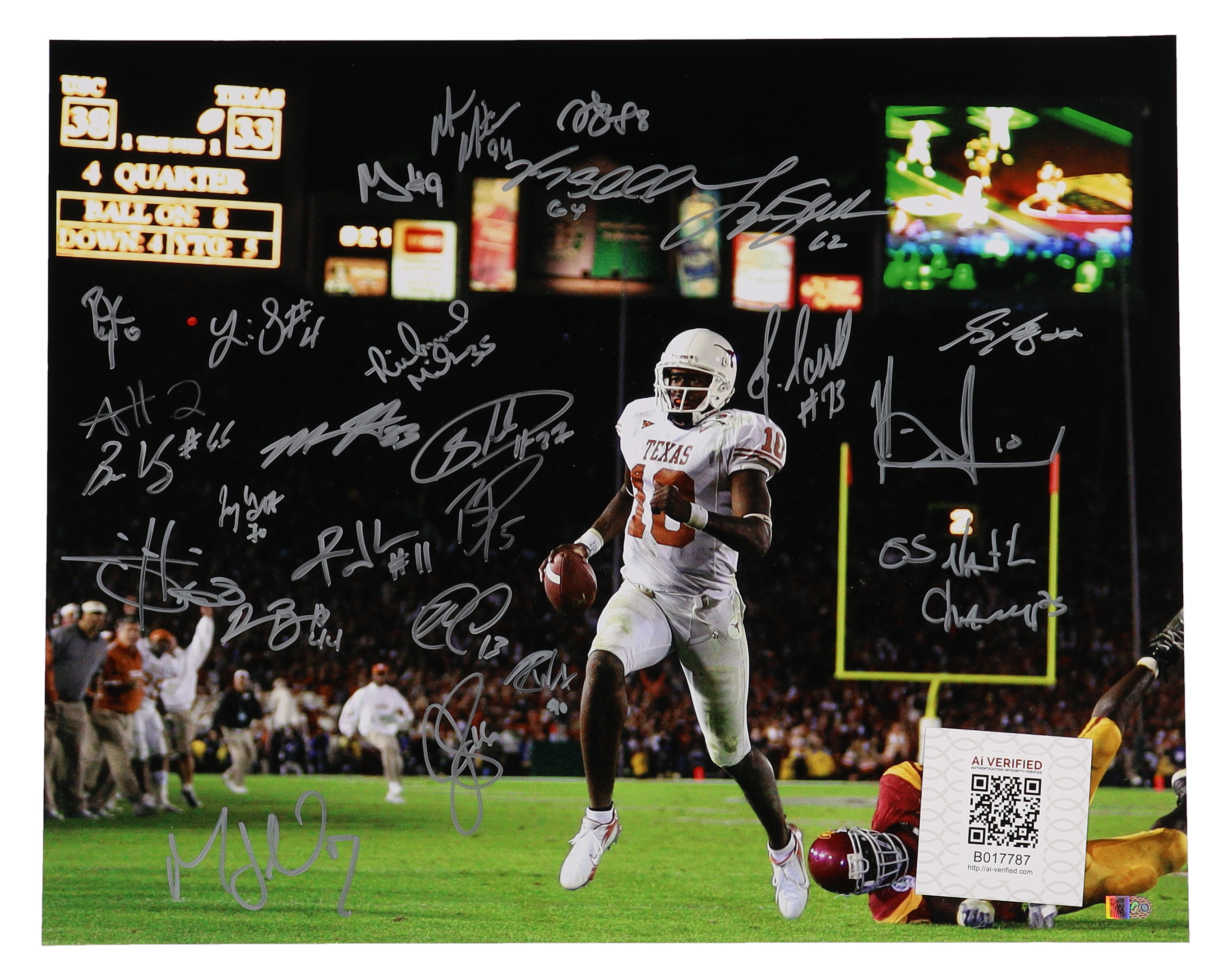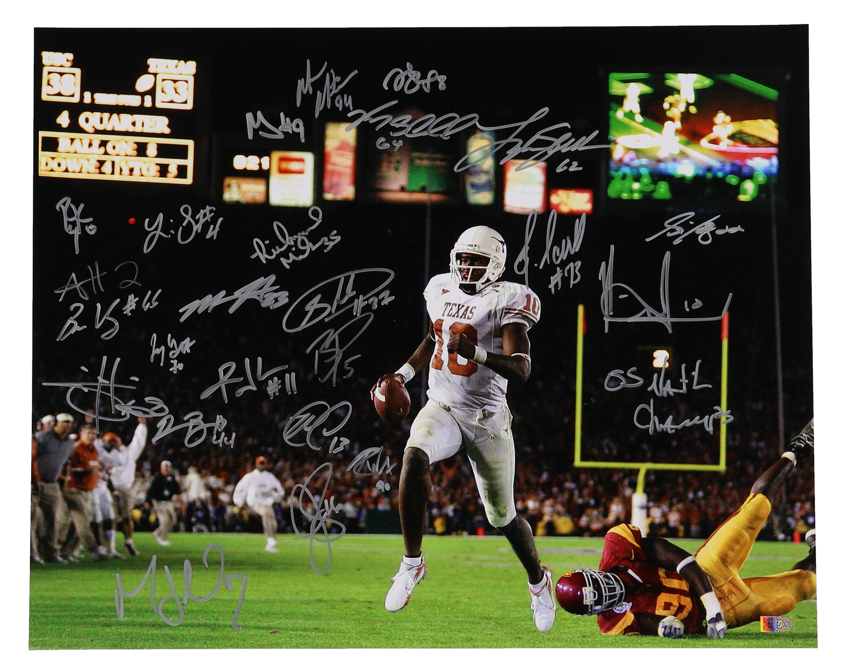 Photo measures 16" x 20" in size and has been team-signed and inscribed by (22) with Vince Young, Jordan Shipley, Jermichael Finley, Cedric Griffin, Limas Sweed, Selvin Young, Michael Griffin, Matt Nordgren, Nate Jones, Rodrique Wright, Aaron Harris, Ryan Palmer, Kasey Studdard, Lyle Sendlein, Robert Killebrew, Billy Pittman, Ramonce Taylor, Richmond McGee, Myron Hardy, Greg Dolan, Marco Martin, Brett Valdez.