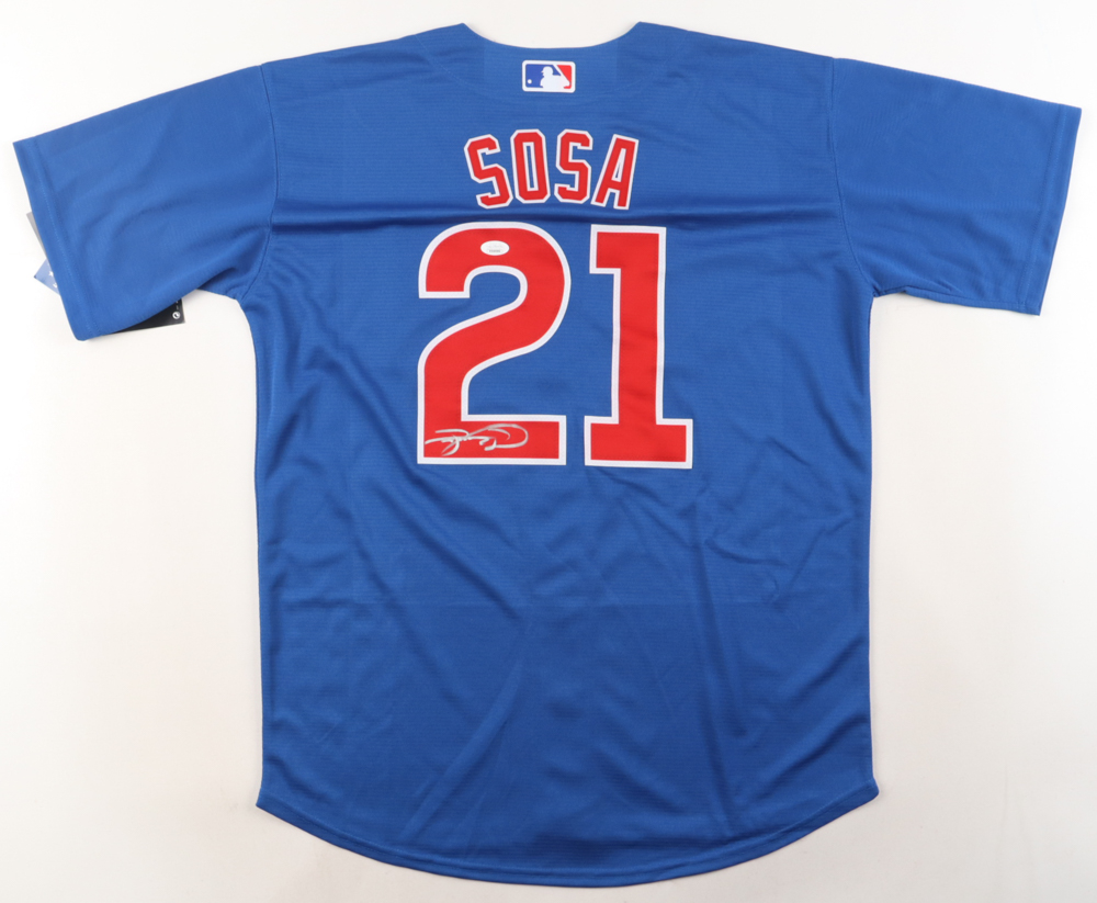 Nike jersey. Everything is pressed on, size L. Hand-signed by Sammy Sosa.