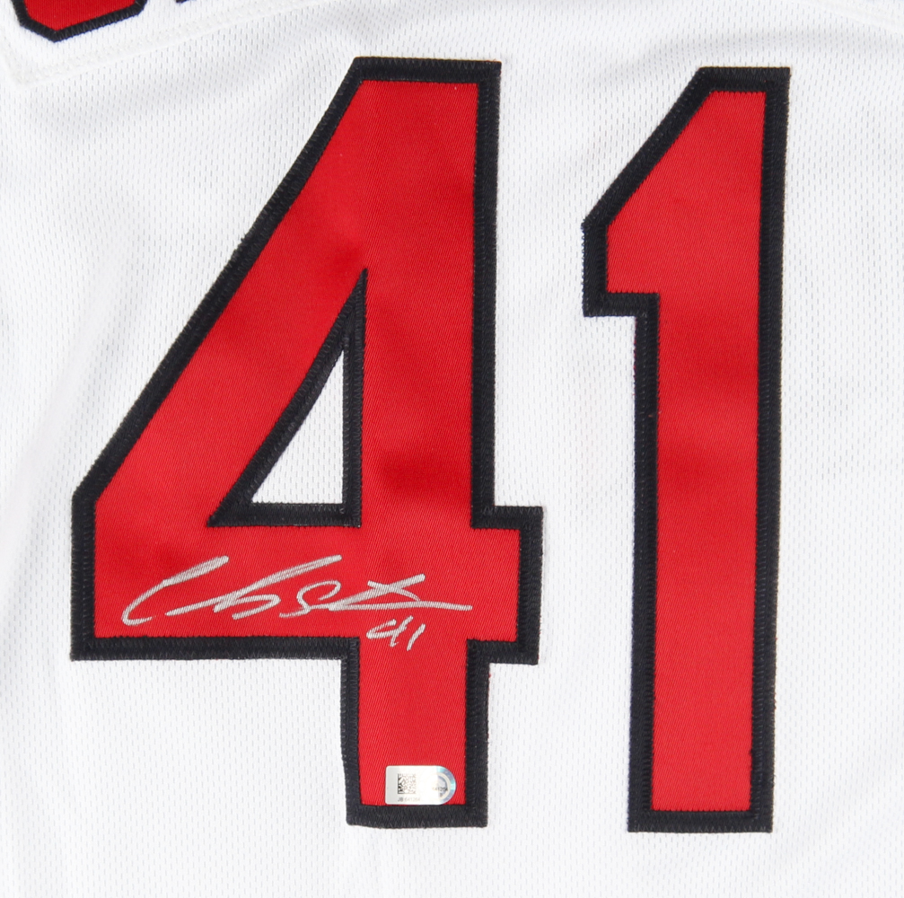 Authentic Majestic on-field style jersey. Everything is sewn on, size 44. Hand-signed in silver paint pen by Carlos Santana.