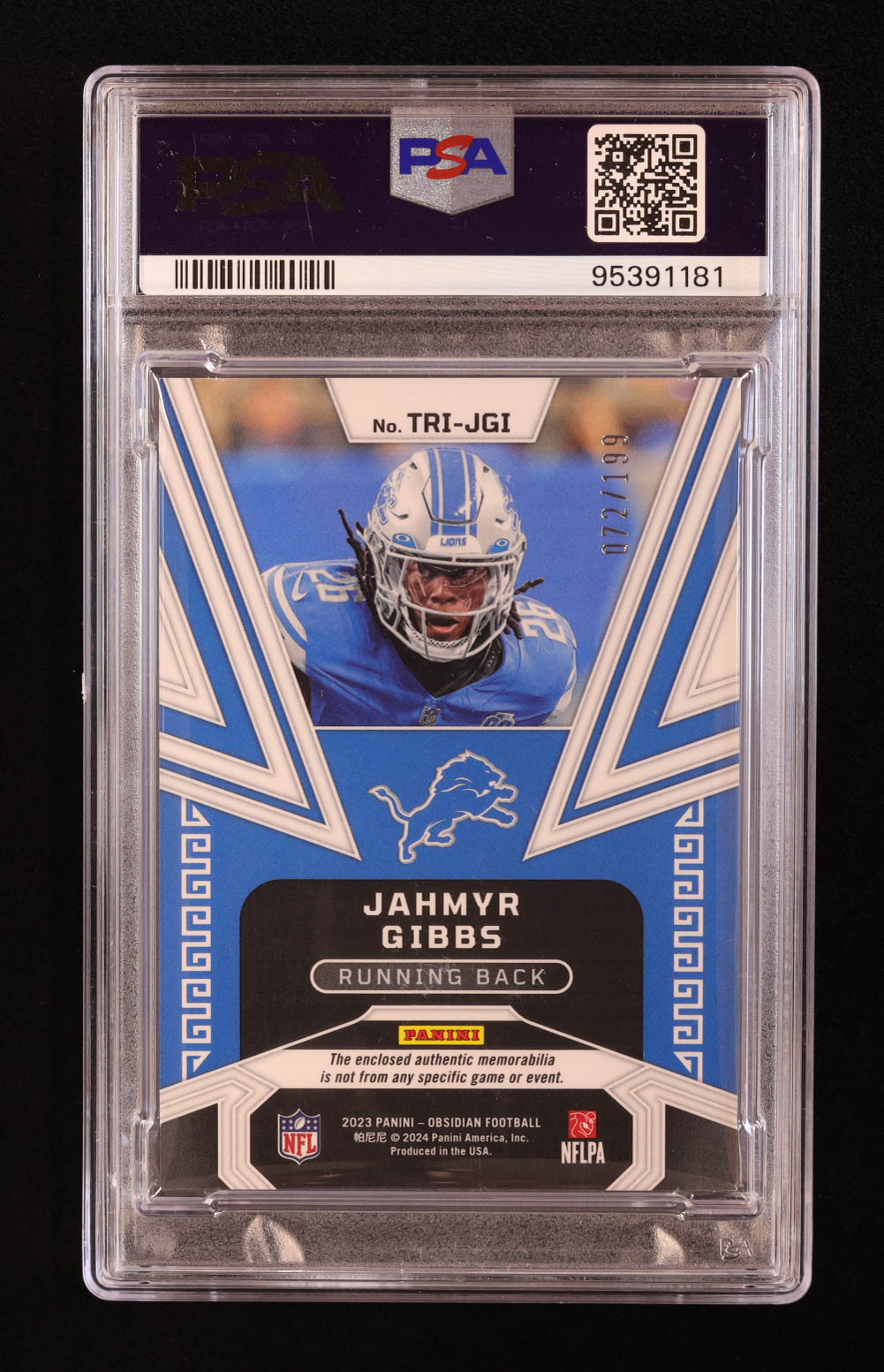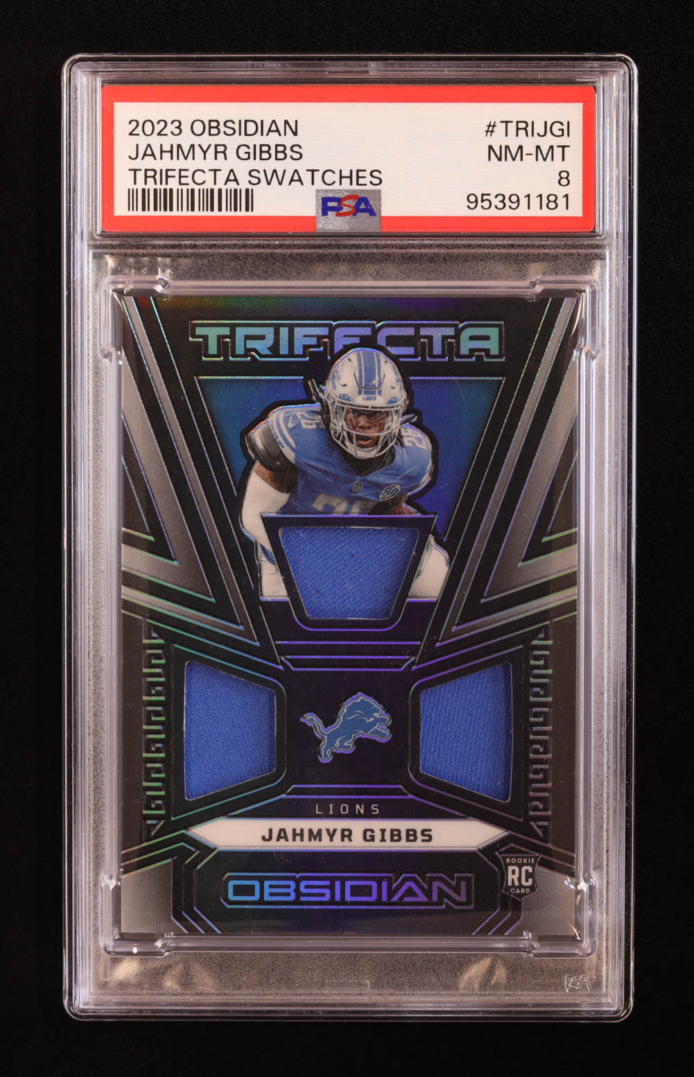 Jahmyr Gibbs 2023 Panini Obsidian Trifecta Swatches #18 RC #72/199 (PSA 8)