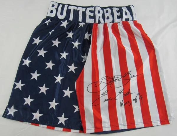 Custom boxing shorts have been hand-signed and inscribed by Eric "Butterbean" Esch.
