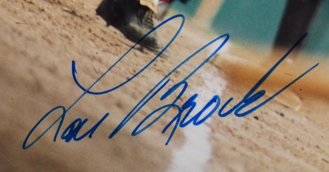 Photo measures 8” x 10” in size and has been hand-signed by Lou Brock (D. 2020, St. Louis Cardinals, HOF).
