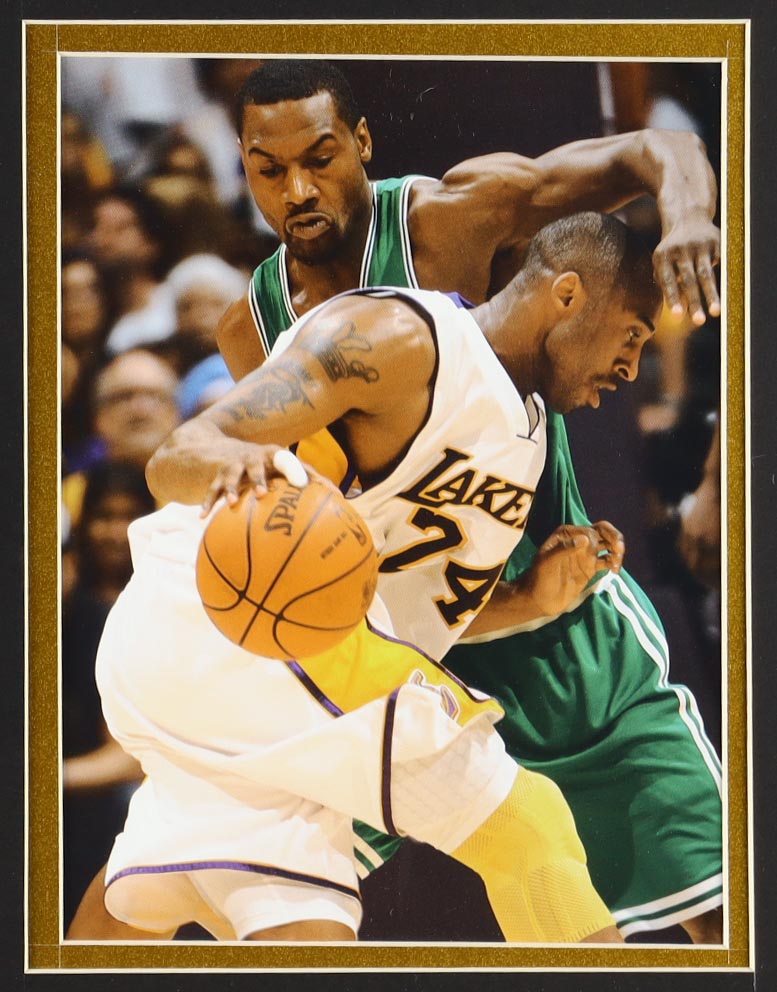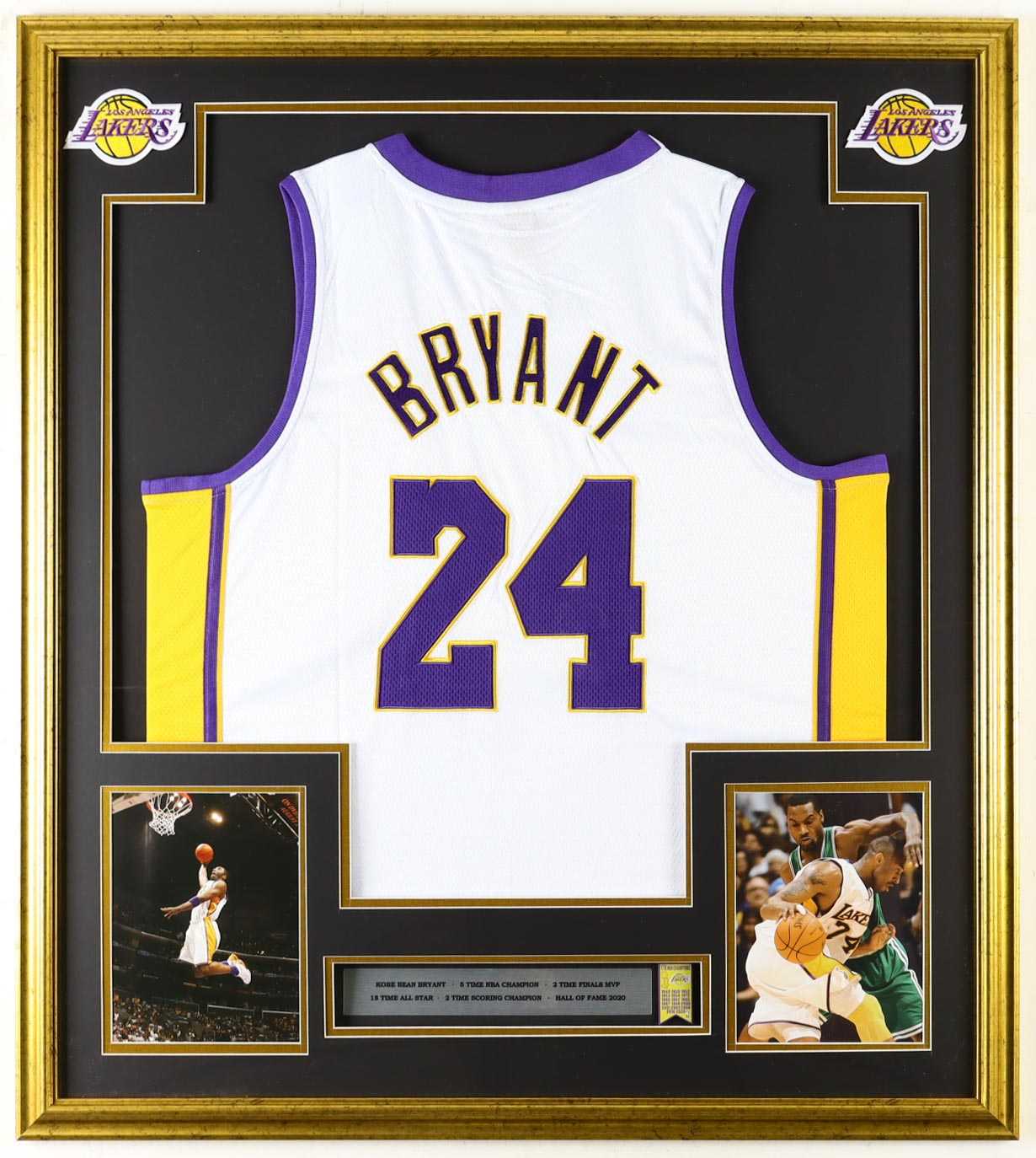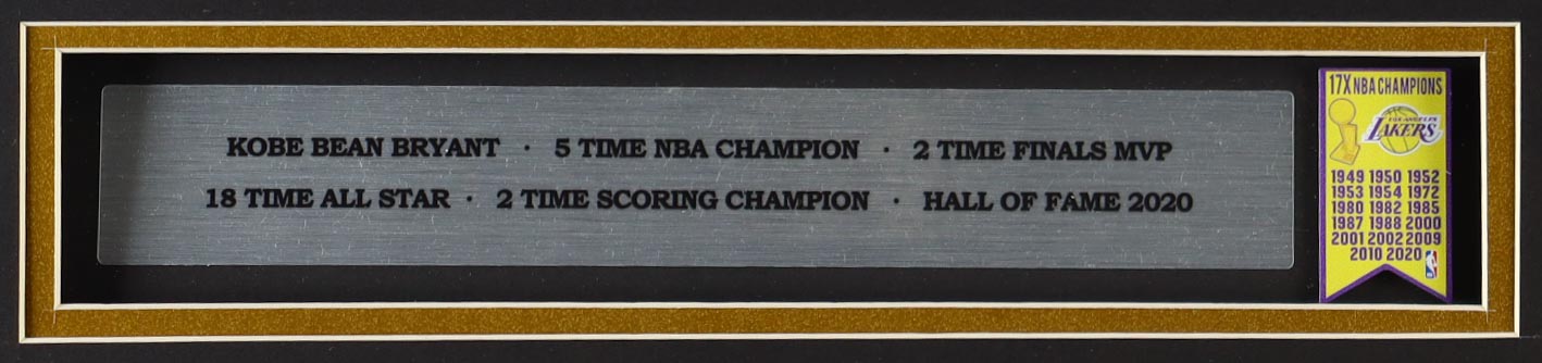 Custom frame measures approximately 33" x 37" in size and features an unsigned Kobe Bryant jersey as well as a mini metal Championship Banner pin and (2) cloth team Logo patches. Please note, the display is unsigned.