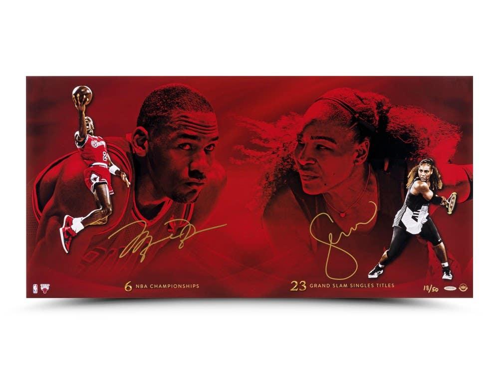 Photo measures 18” x 36” in size and has been hand-signed by Michael Jordan (Chicago Bulls, HOF) and Serena Williams. This item is limited edition and has been numbered #/50.