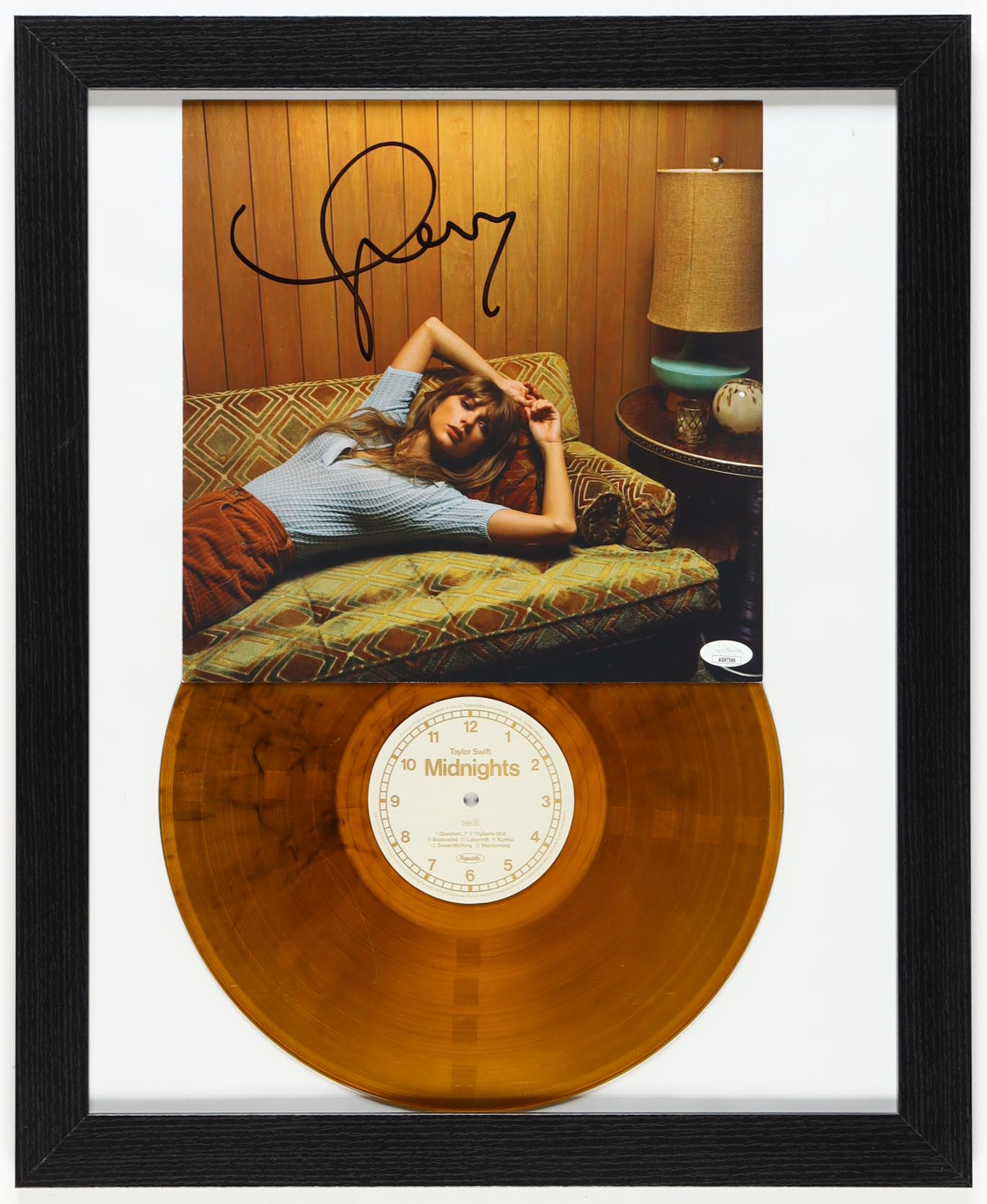 Custom frame measures approximately 18" x 22" in size. Features a "Midnights" record album insert that has been hand-signed by Taylor Swift. The display also includes a vinyl record.
