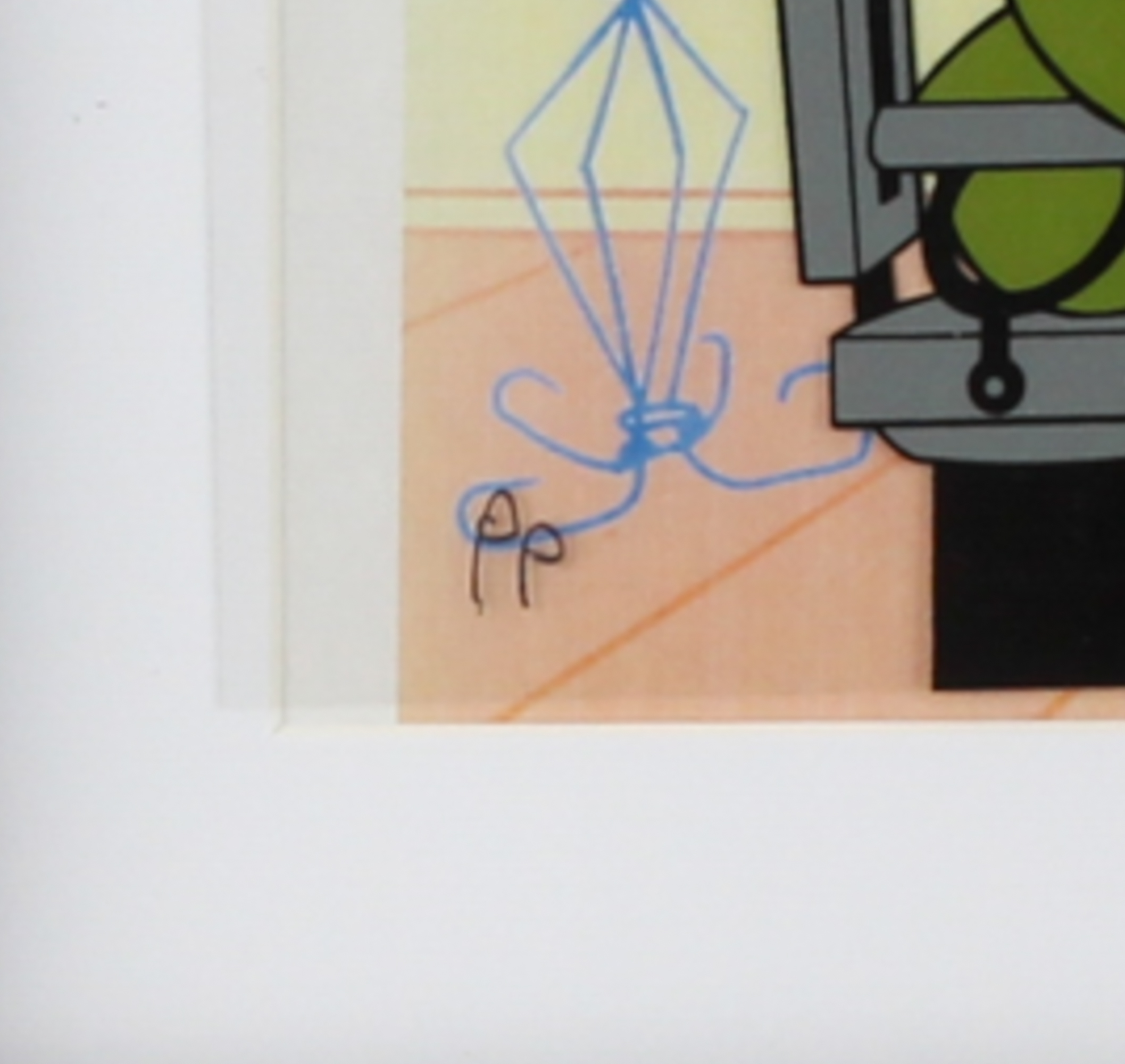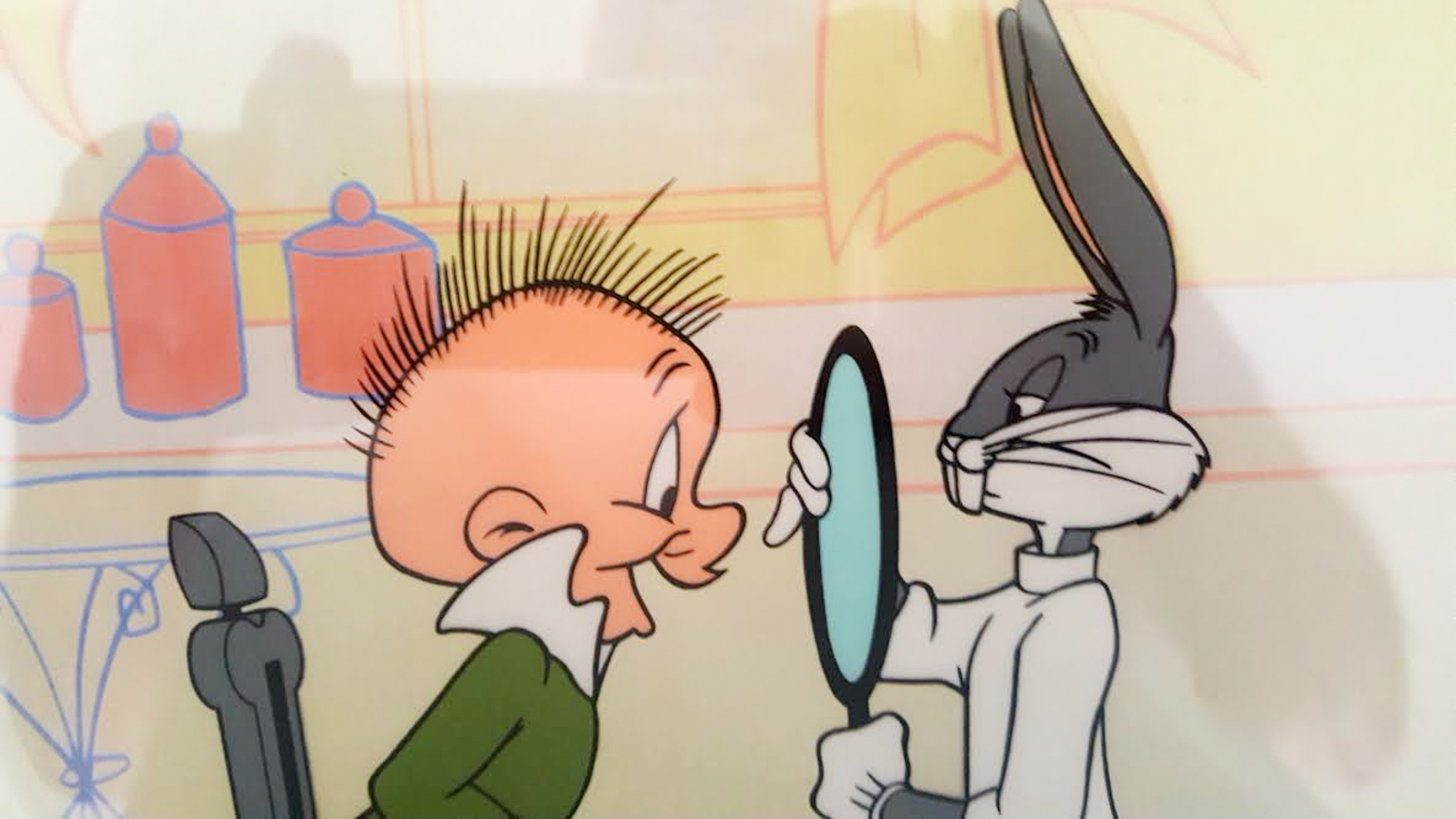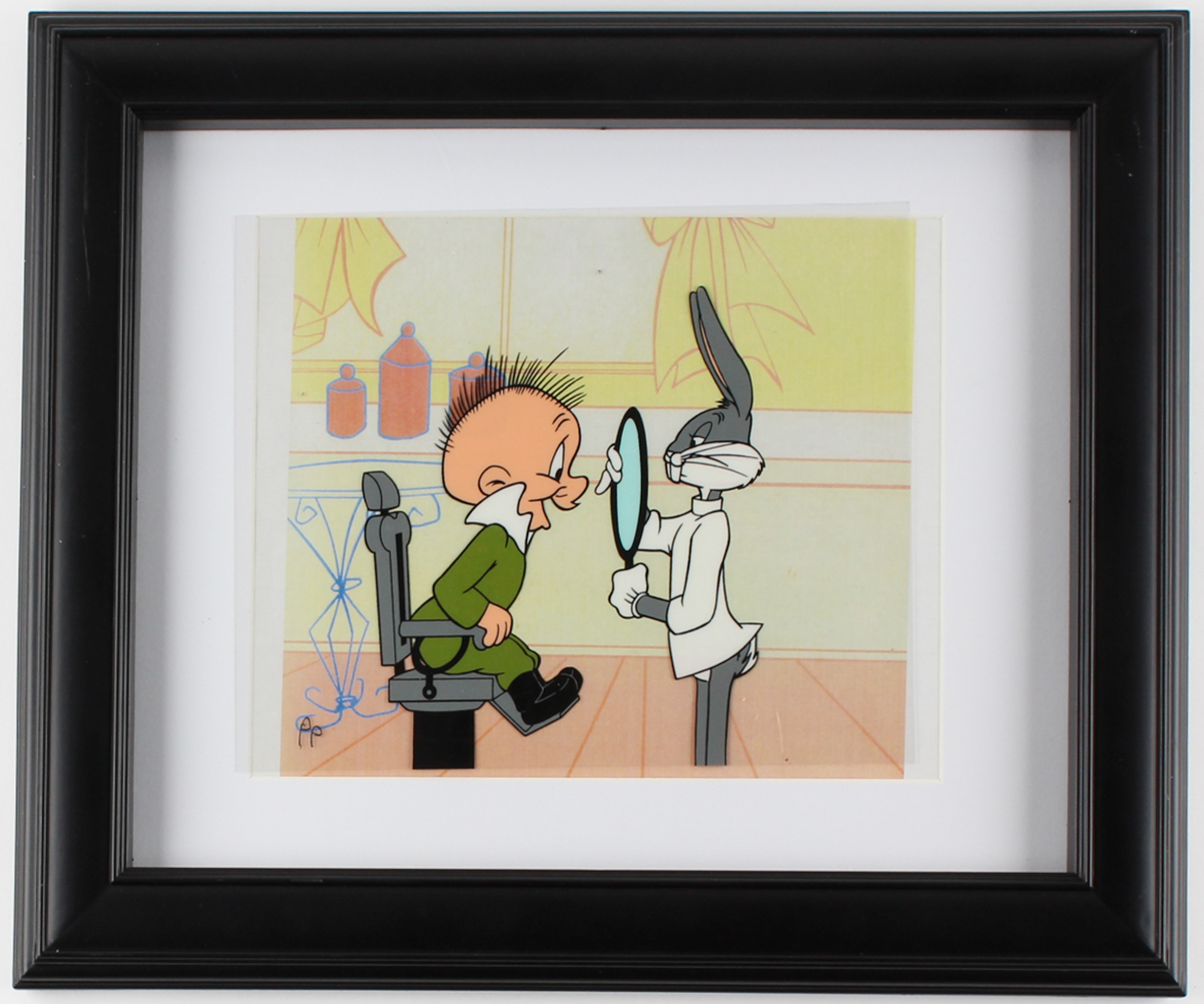 Custom framed sericel measures 14" x 17" in size and features a Bugs Bunny and Elmer Fudd sericel animation from Warner Bros.