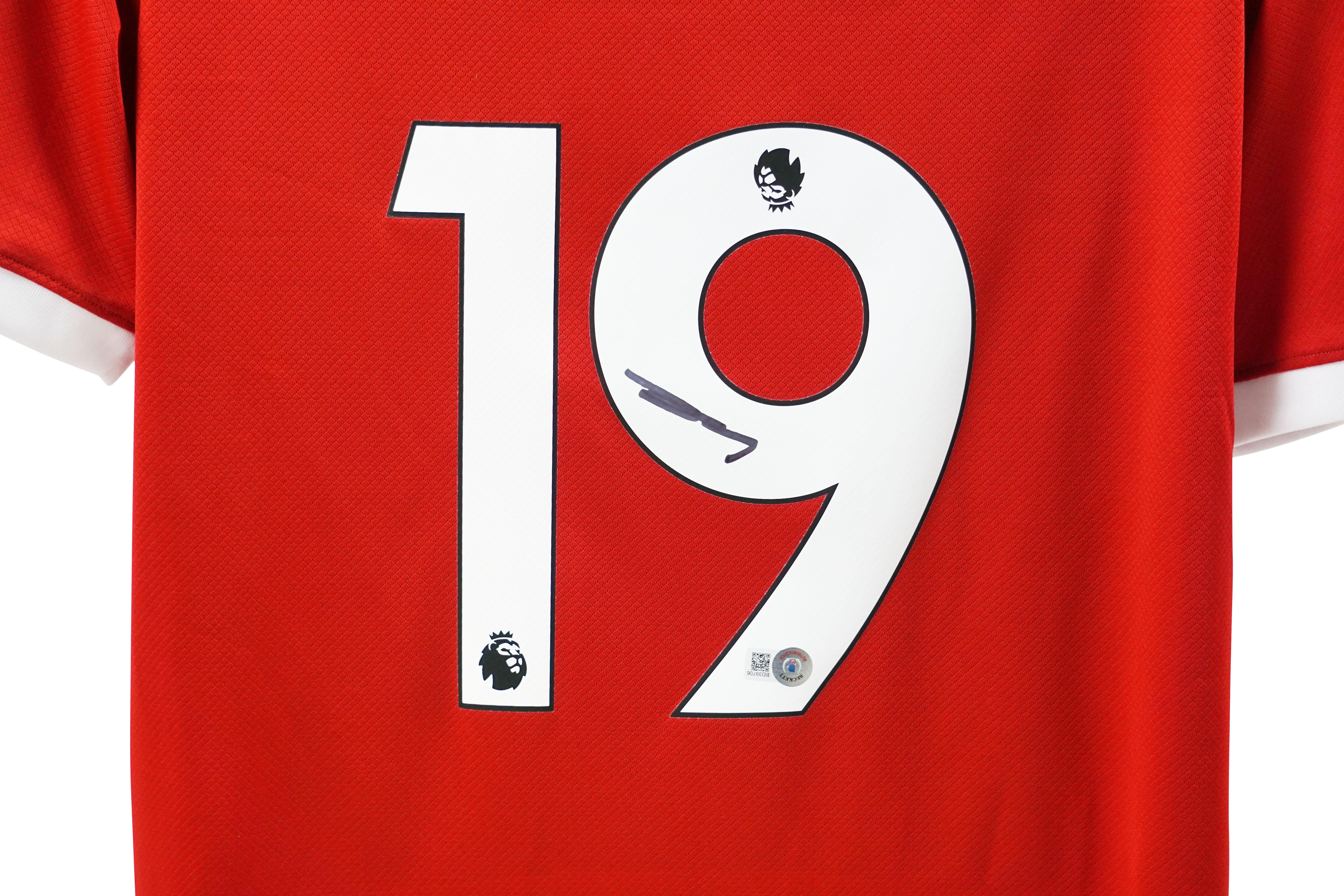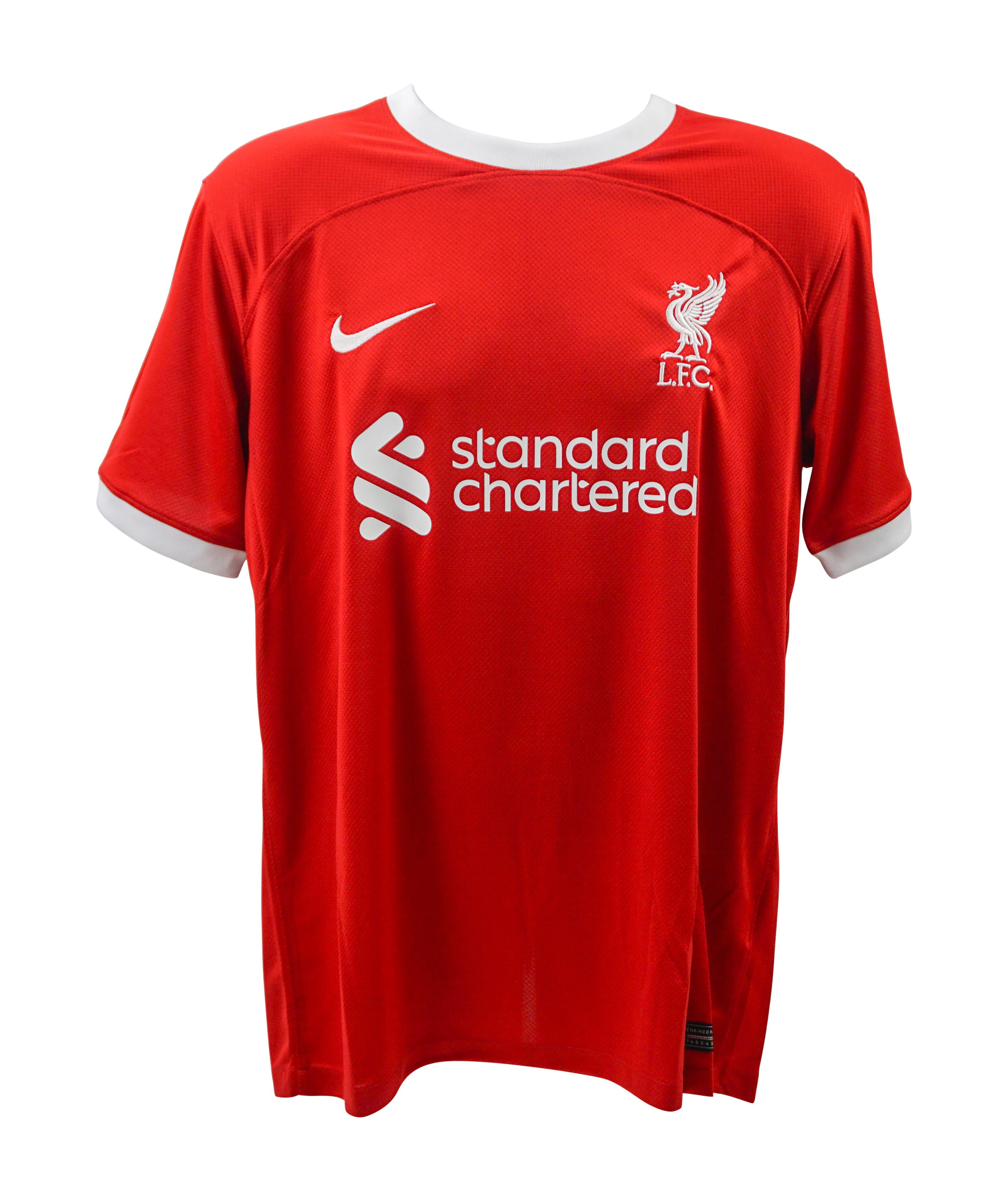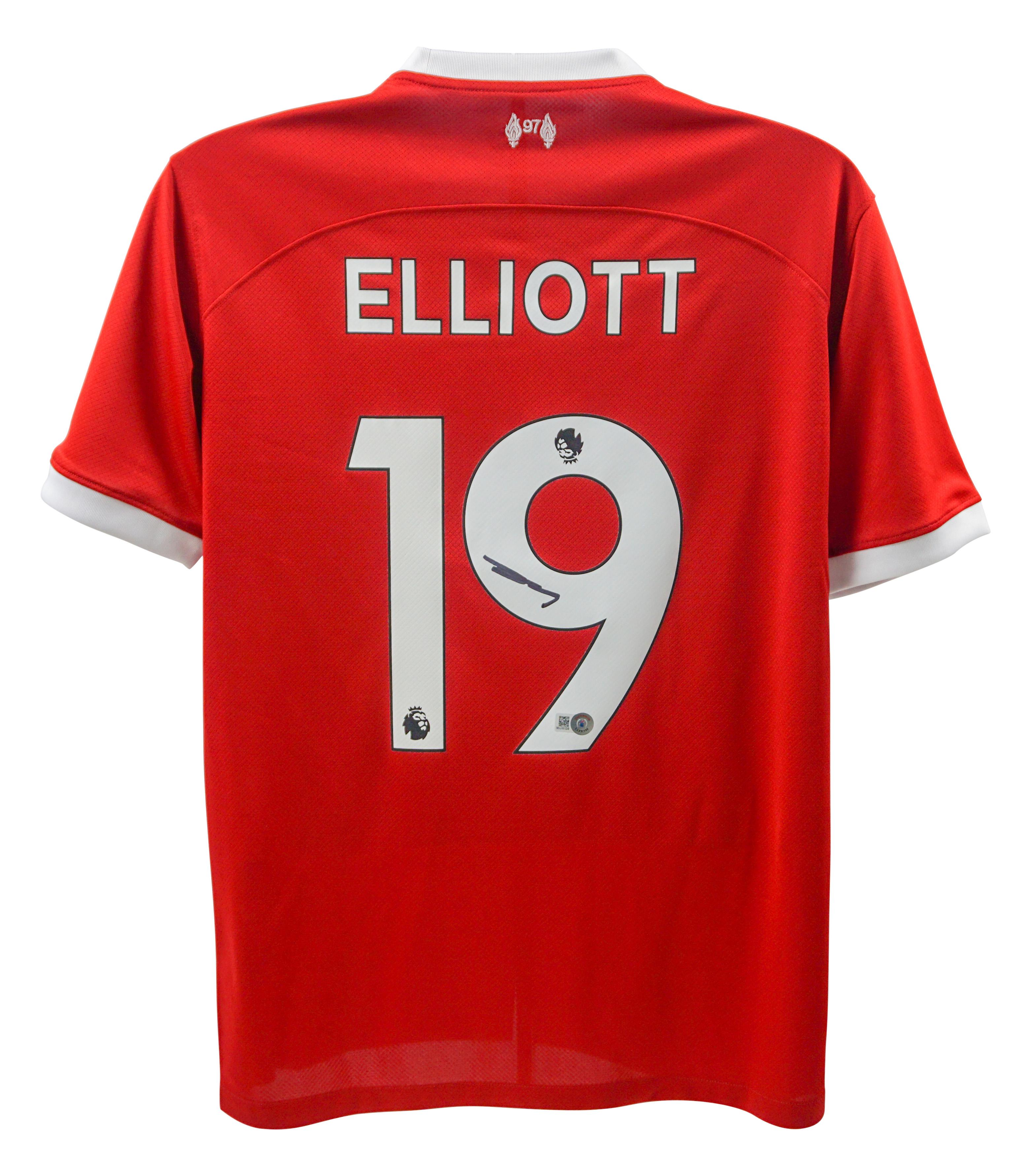 Nike style jersey with everything pressed on, size L. Hand-signed by Harvey Elliott.