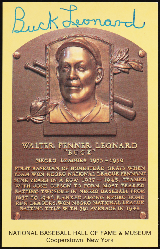 Hall of Fame Plaque Postcard has been hand-signed by Buck Leonard (D. 1997, Homestead Grays, HOF).