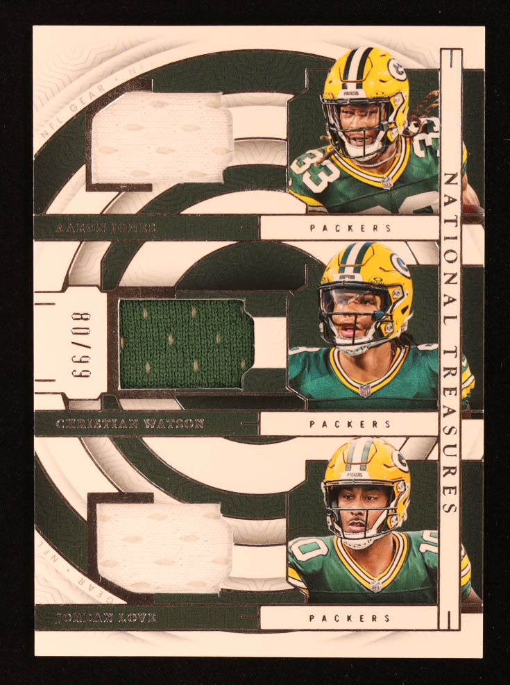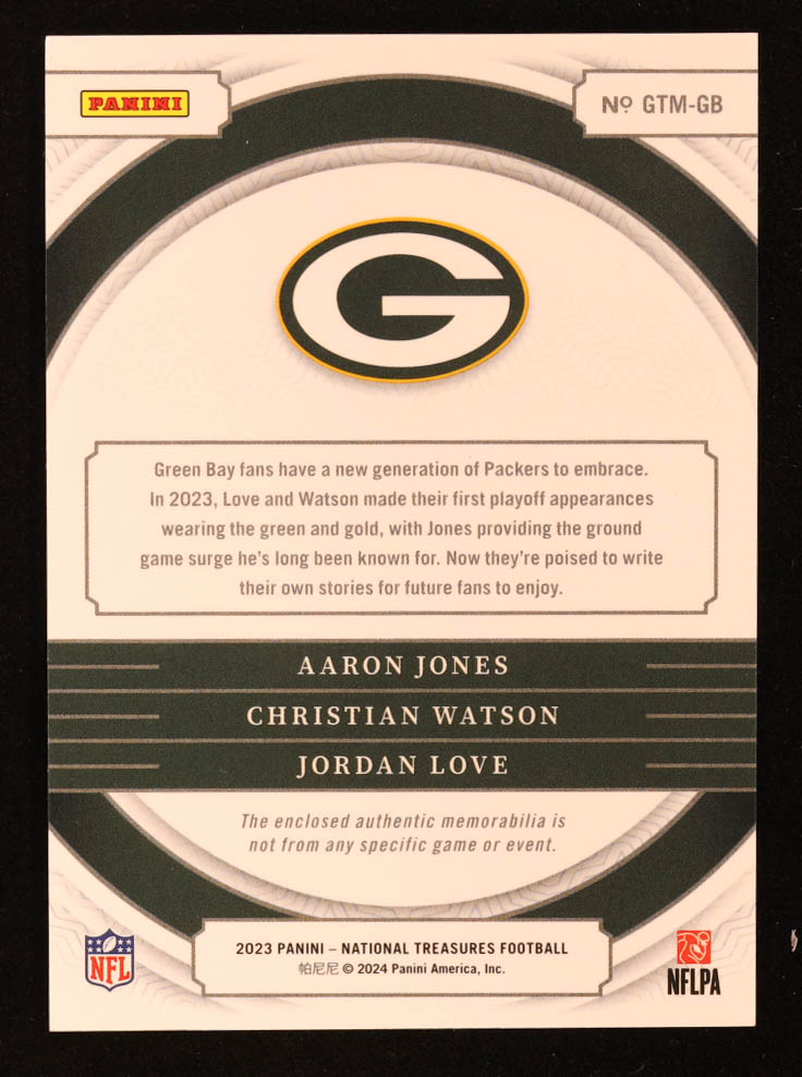 Aaron Jones / Christian Watson / Jordan Love 2023 National Treasures NFL Gear Trio Materials #GB #80/99