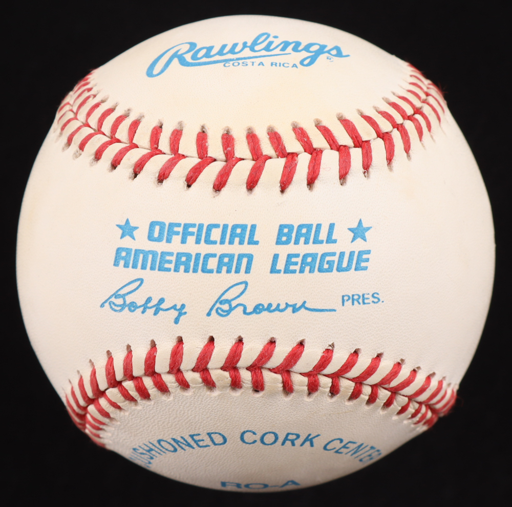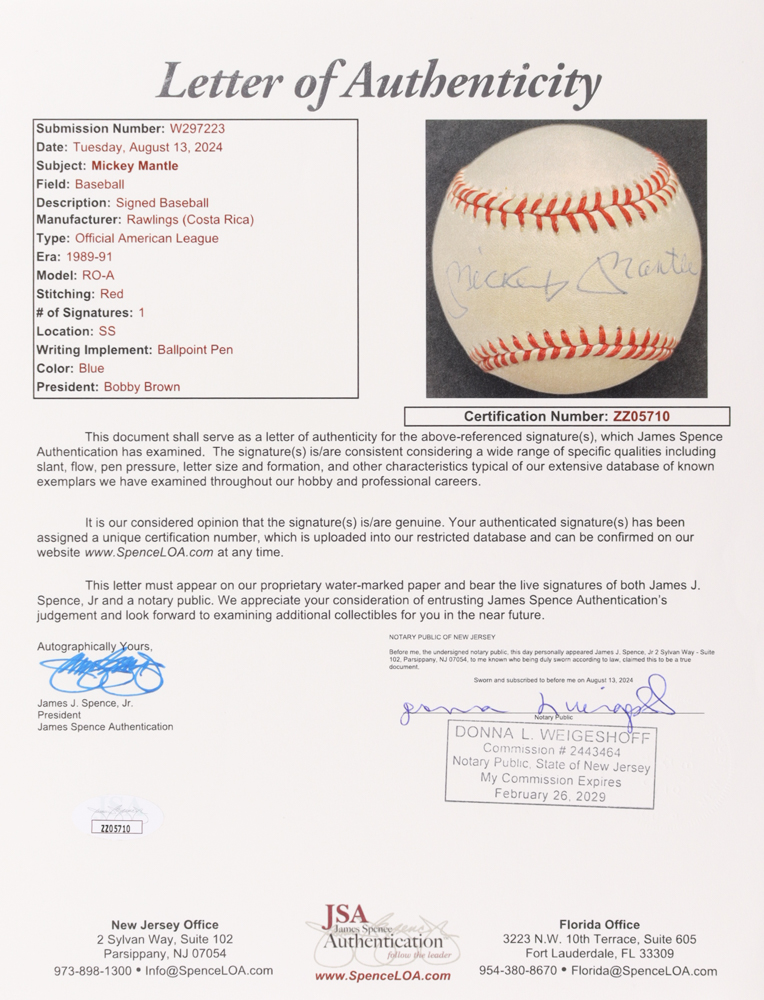 Rawlings Official American League baseball has been hand-signed by Mickey Mantle (D. 1995, New York Yankees, HOF). Please note ball is naturally toned.