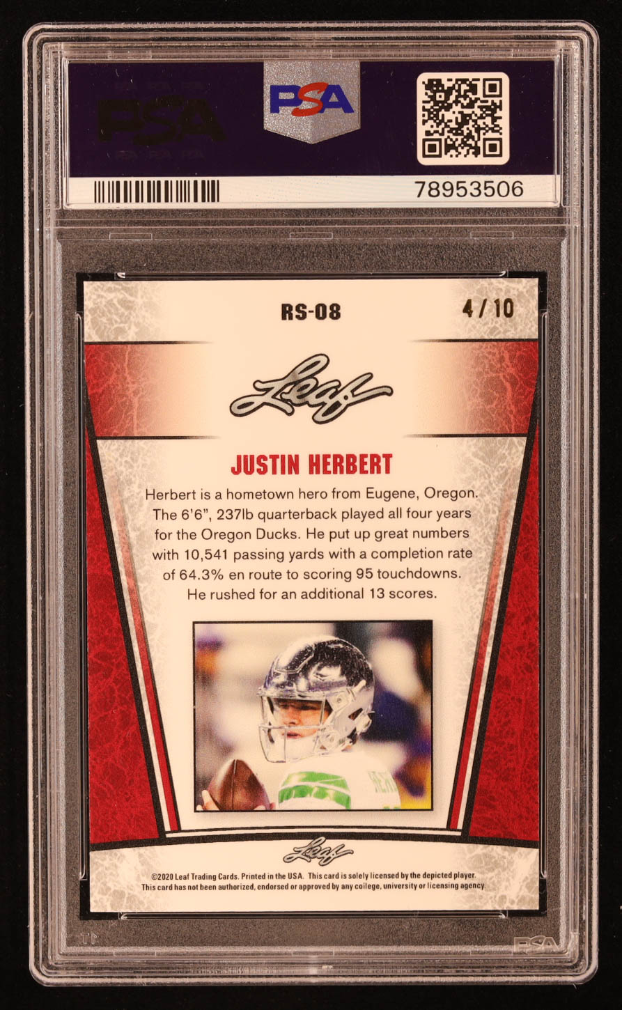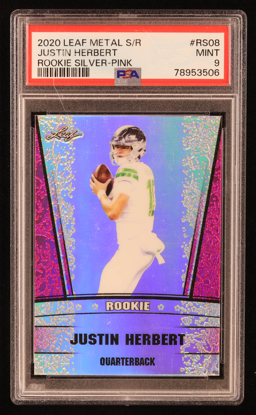Justin Herbert 2020 Leaf Metal Special Release Rookie Silver Rainbow Pink #SR2008 RC #04/10 (PSA 9)