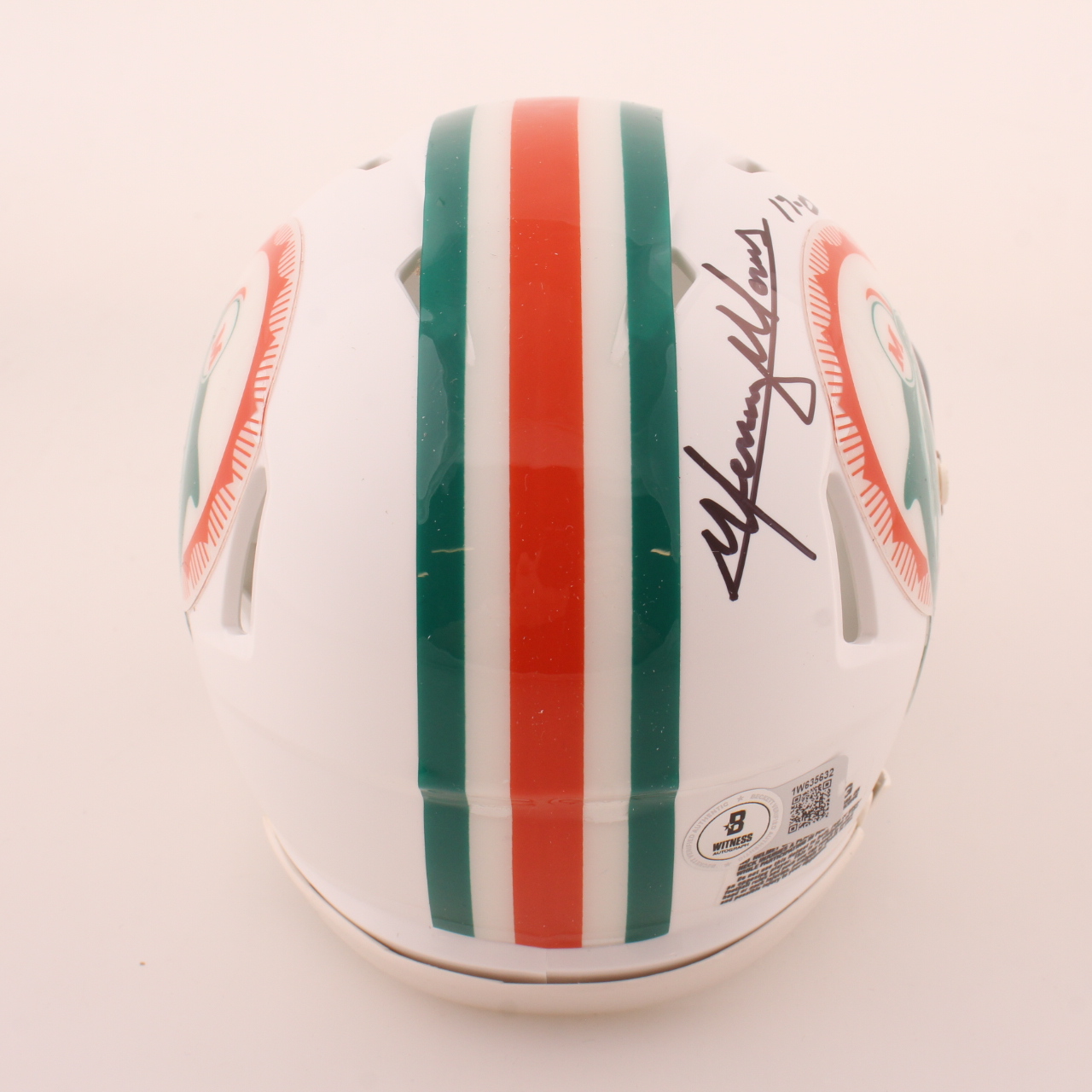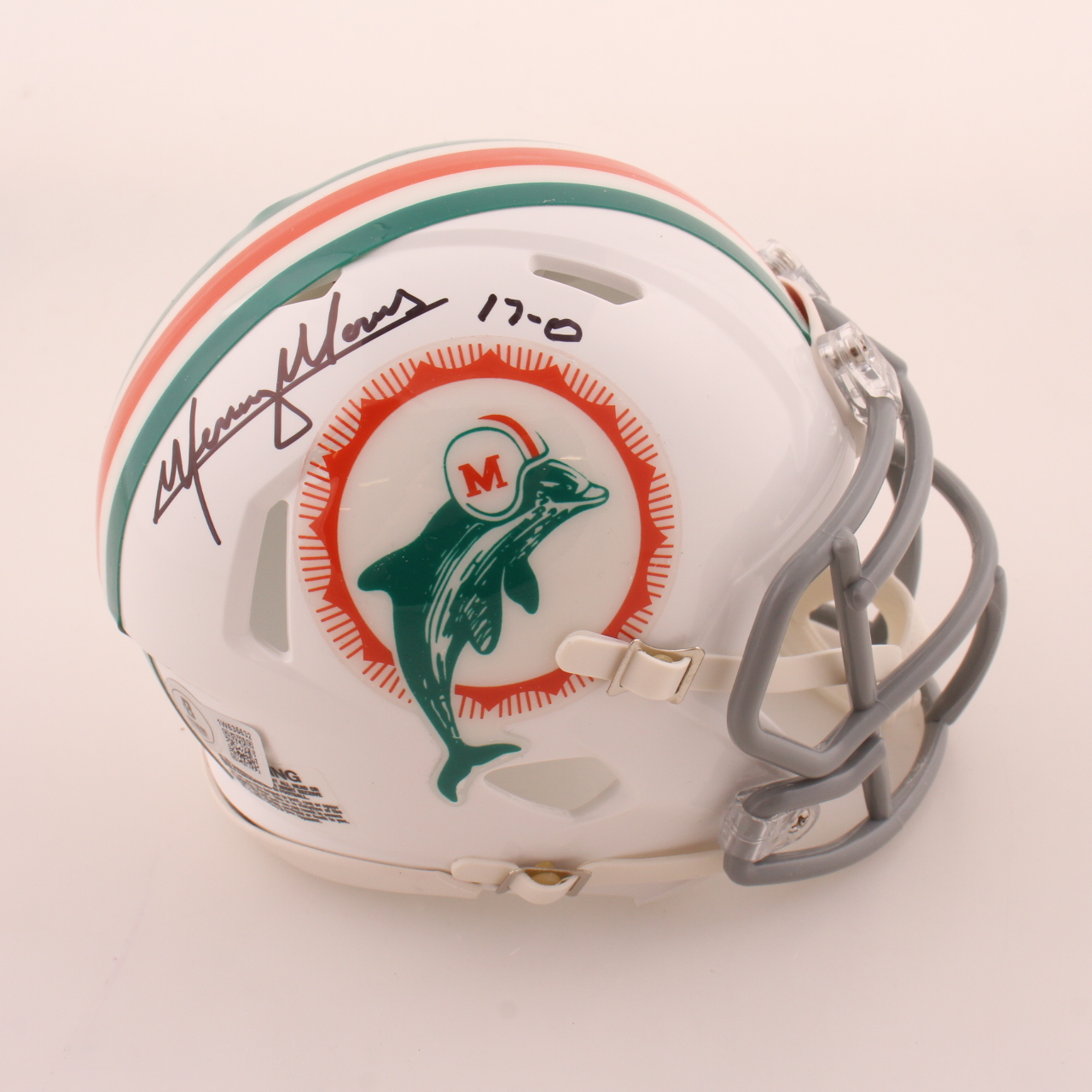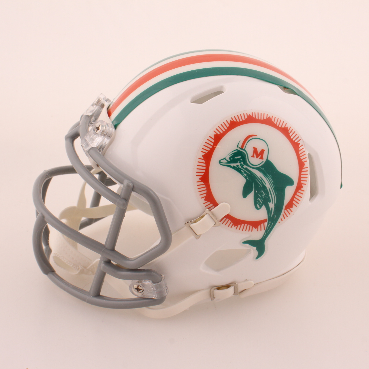 Riddell Miami Dolphins throwback speed mini helmet. Hand-signed and inscribed by Mercury Morris.