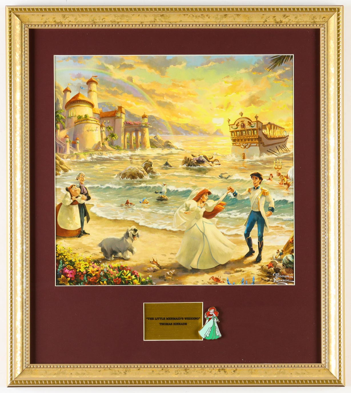 Custom frame measures approximately 16" x 18" in size and features a print of "The Little Mermaid" by Thomas Kinkade (D. 2012). The display also features a Ariel Character Pin. Please note, the display is unsigned.