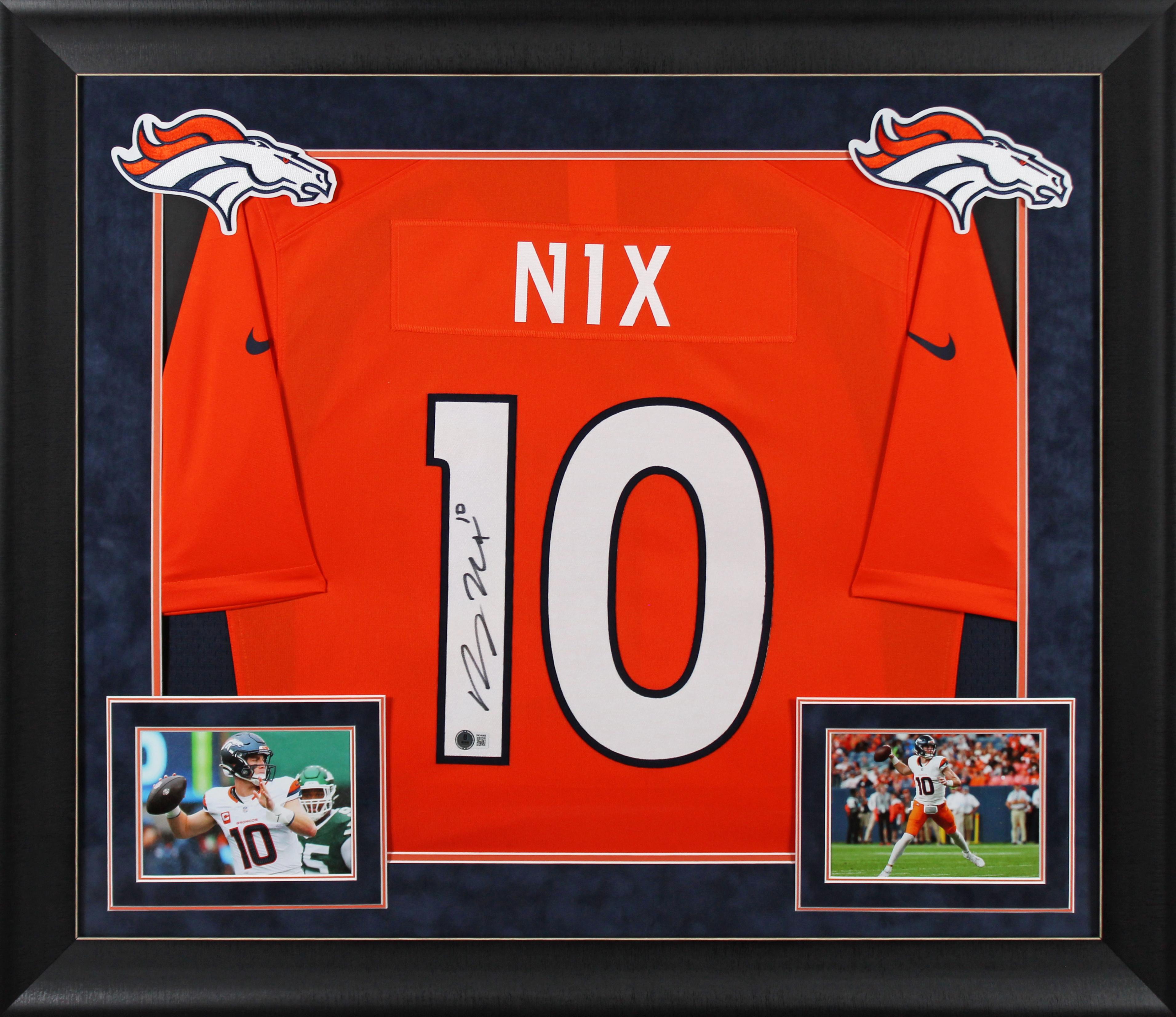 Custom frame measures 32" x 37” in size and features a jersey that has been hand-signed by Bo Nix (Denver Broncos).
