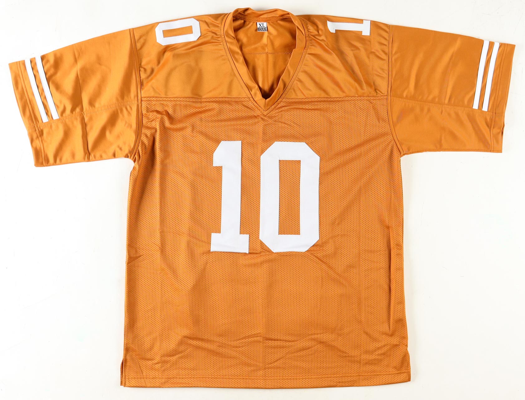 Custom jersey with everything sewn on, size XL. Hand-signed by Vince Young. Young's career highlight stats have been stitched onto the jersey under the reverse numbers.