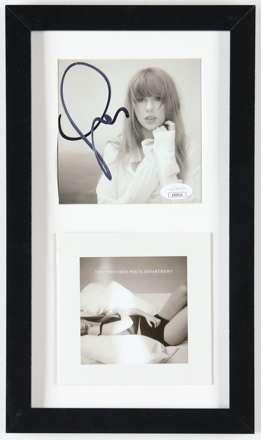 Custom frame measures approximately 8" x 13.5" in size. Features a "The Torture Poets Department" CD insert that has been hand-signed by Taylor Swift. Please note, there is no plexiglass in the display.