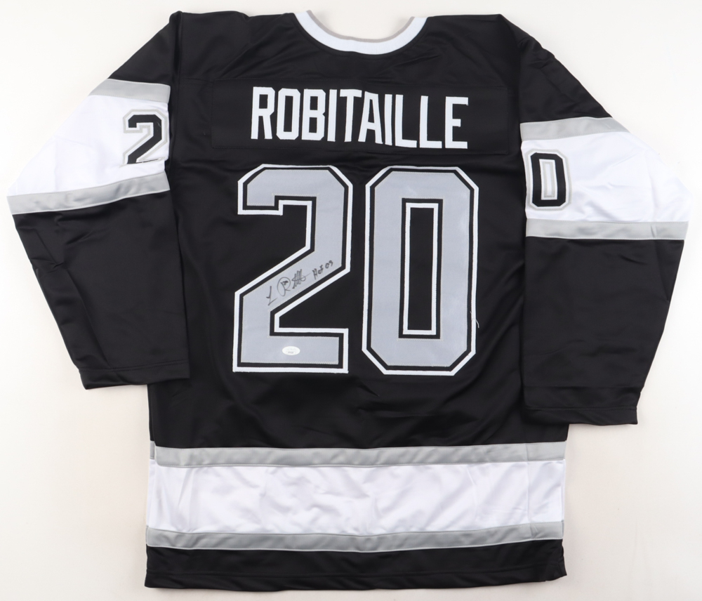Custom jersey with everything sewn on, size XL. Hand-signed and inscribed by Luc Robitaille (HOF).