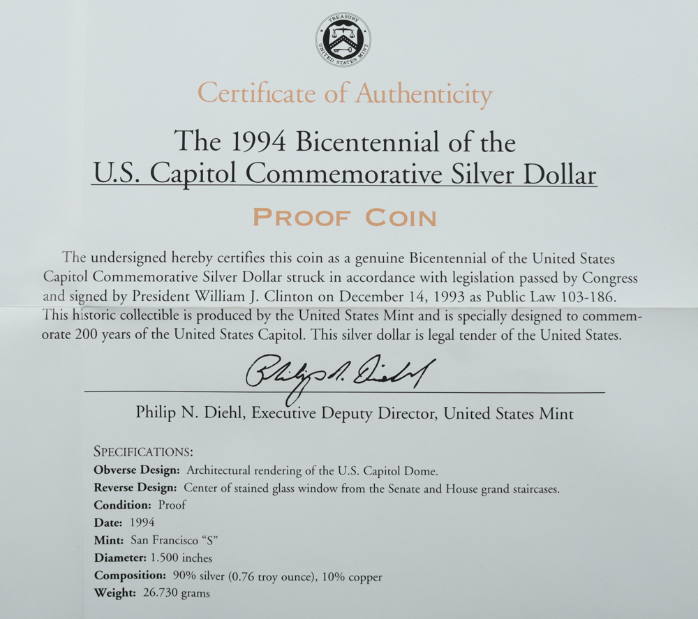 1994 United States Bicentennial of the US Capitol Commemorative Silver Dollar