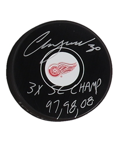 Chris Osgood Signed Red Wings Logo Hockey Puck Inscribed "3x SC Champ 97, 98, 08" (JSA)