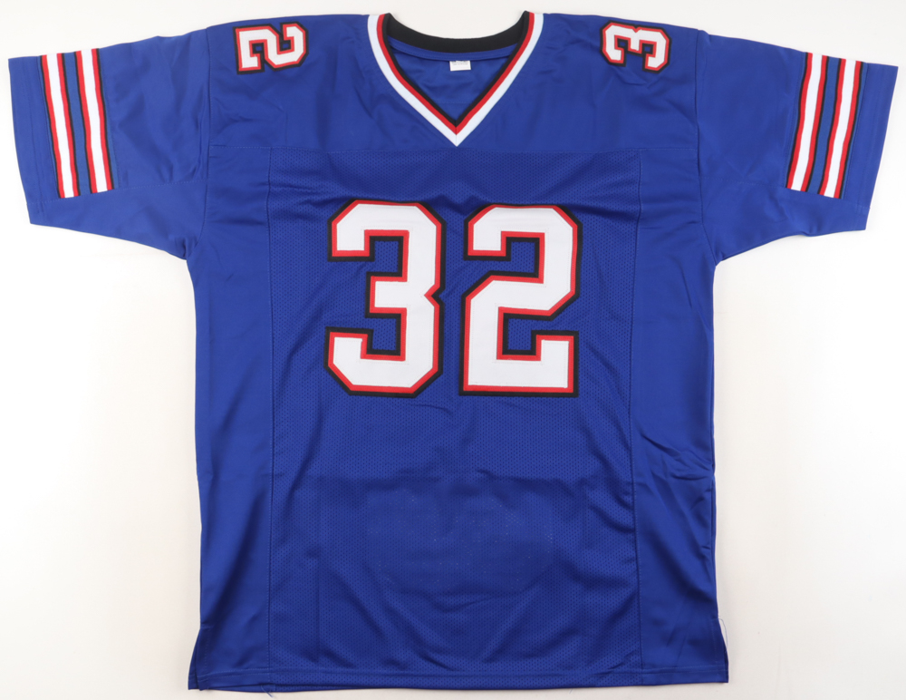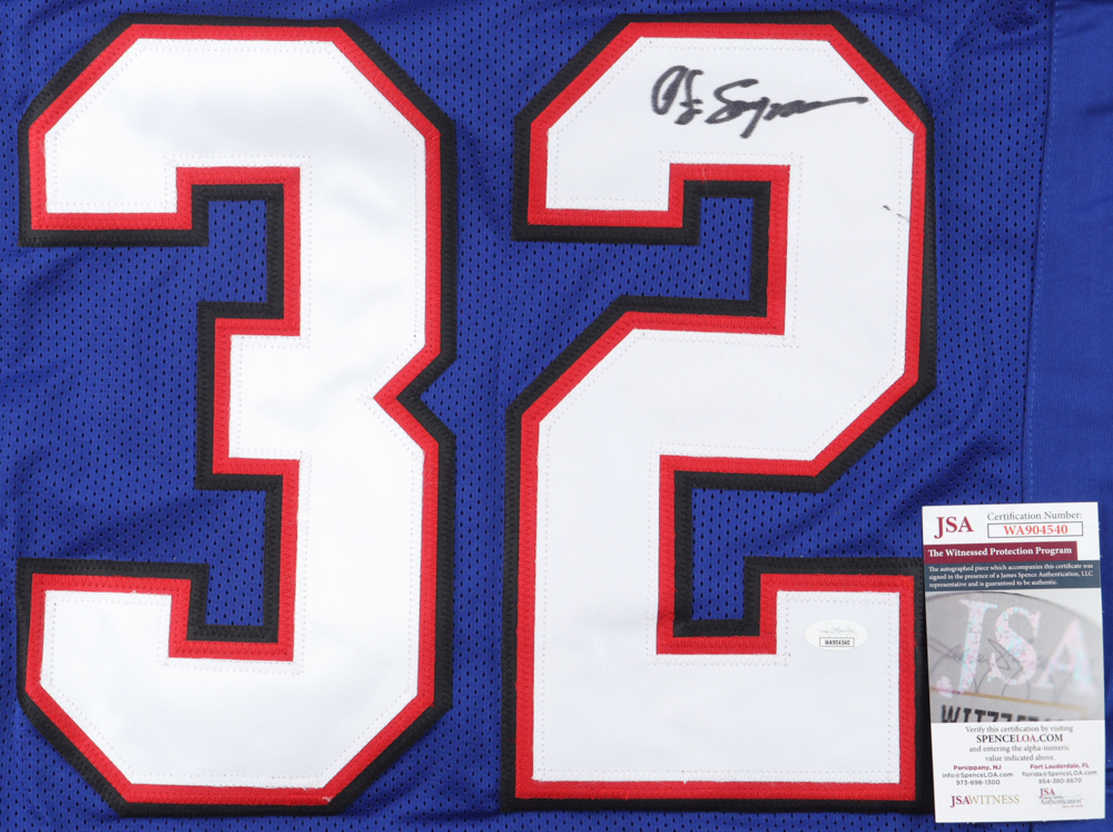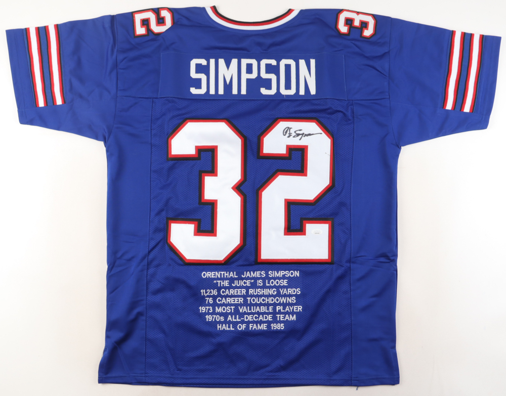 Custom style jersey with everything sewn on, size XL. Hand-signed by O.J. Simpson (D. 2024, HOF). Simpson's career stats are stitched on below the reverse side numbers. Please note, there is a stray ink mark on the reverse number.