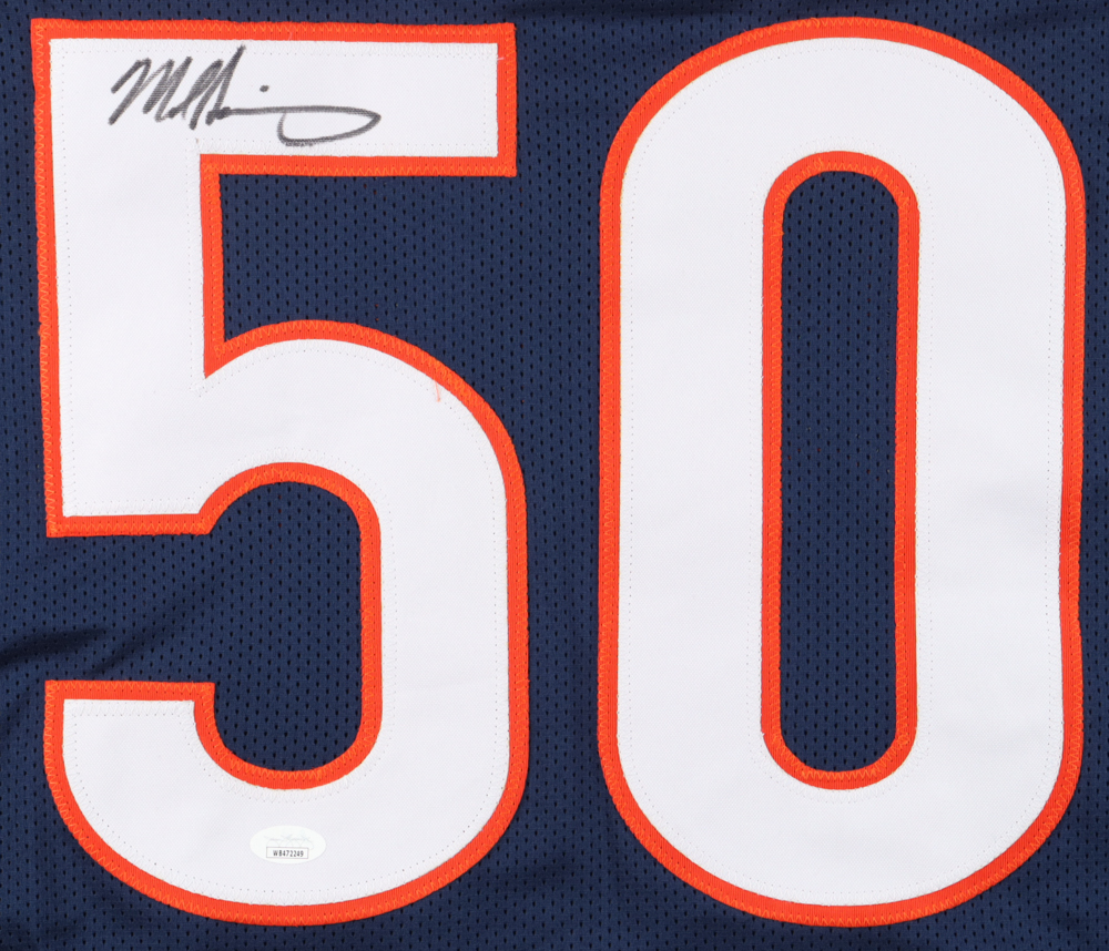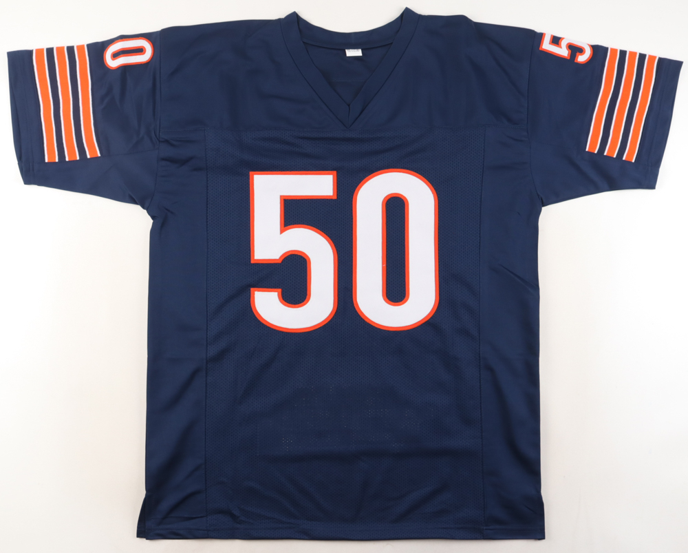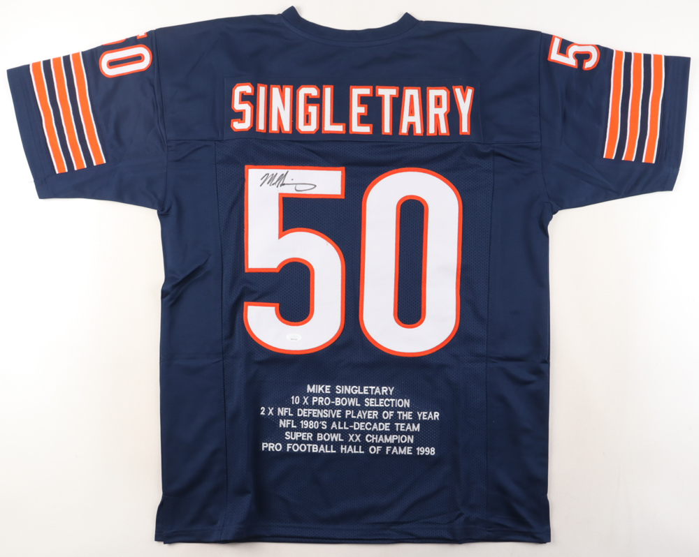 Custom jersey. Everything sewn on, size XL. Hand-signed by Mike Singletary (HOF). Singletary's career stats are stitched on below the reverse side numbers.