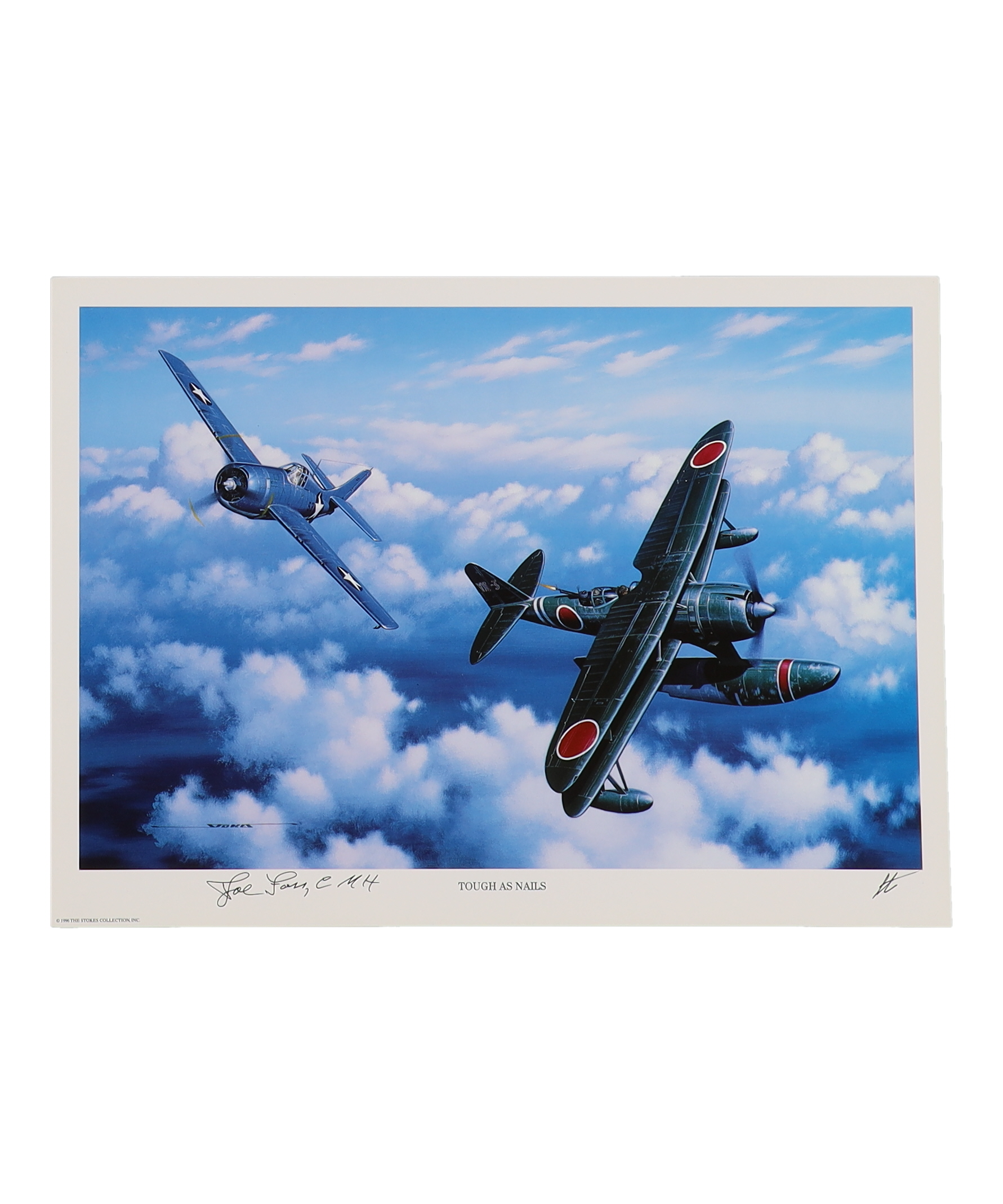Don't miss your chance to own this rare piece of military memorabilia. Bid now and make this hand-signed Stan Stokes lithograph of """"Tough as Nails,"""" authenticated by AI-Verified authentication services, the centerpiece of your collection. Honor the bravery and valor of WWII ace Joe Foss and commemorate the legacy of all those who served with courage and distinction during World War II. Place your bid today and let this extraordinary piece of history take pride of place in your collection! ""