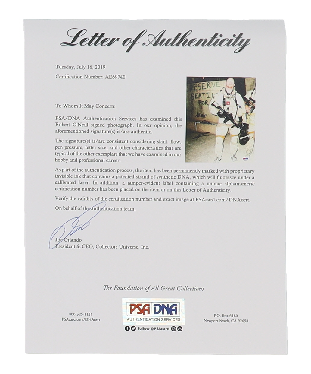 Robert O'Neill's name resonates deeply within the annals of military history. As a highly decorated Navy SEAL, his courage and skill have been instrumental in numerous critical missions, embodying the ethos of valor, loyalty, and sacrifice. Now, you have the exclusive opportunity to own a piece of this storied legacy – authenticated by the esteemed PSA/DNA authentication services.