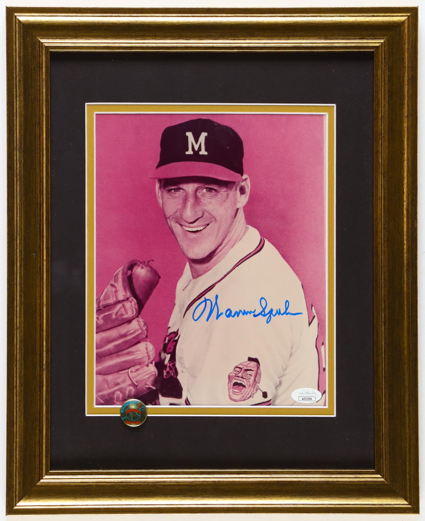 Custom frame measures approximately 13.25" x 16.25" in size and features a photo hand-signed by Warren Spahn (D. 2003, Milwaukee Braves, HOF). The display also includes a vintage team pin.