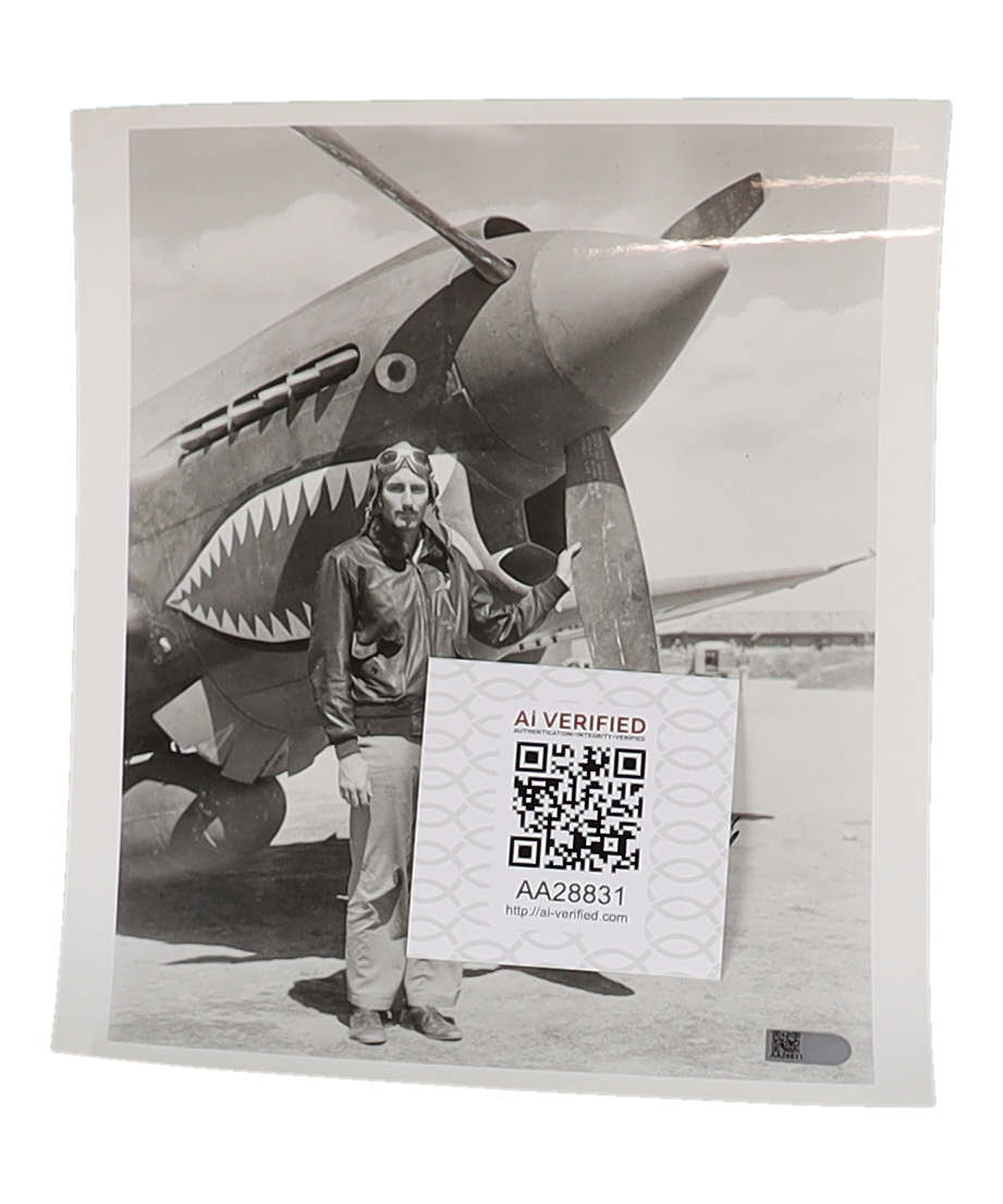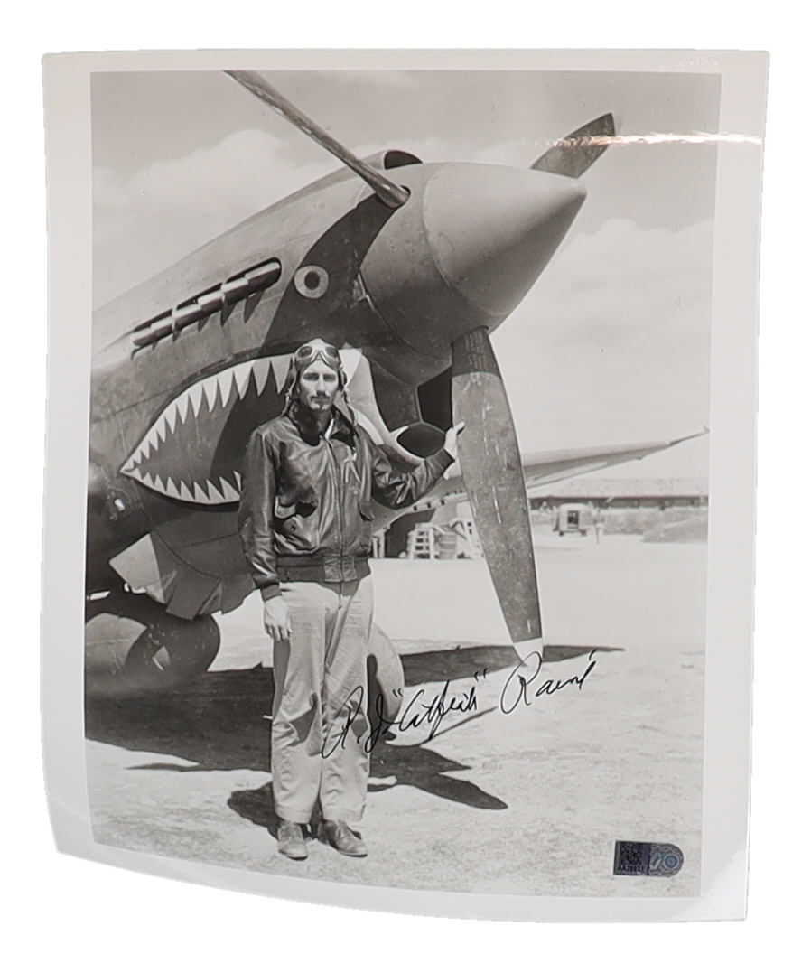 "Available for auction is a hand-signed 8x10 photograph autographed by **Robert Raine**, a WWII pilot who flew the renowned **P-40 Warhawk** as a member of the legendary **American Volunteer Group (AVG),** famously known as the **Flying Tigers**. Raine’s service with the AVG contributed to the early successes of Allied air forces in the Pacific Theatre, and his legacy as a Flying Tiger remains an important chapter in military aviation history.