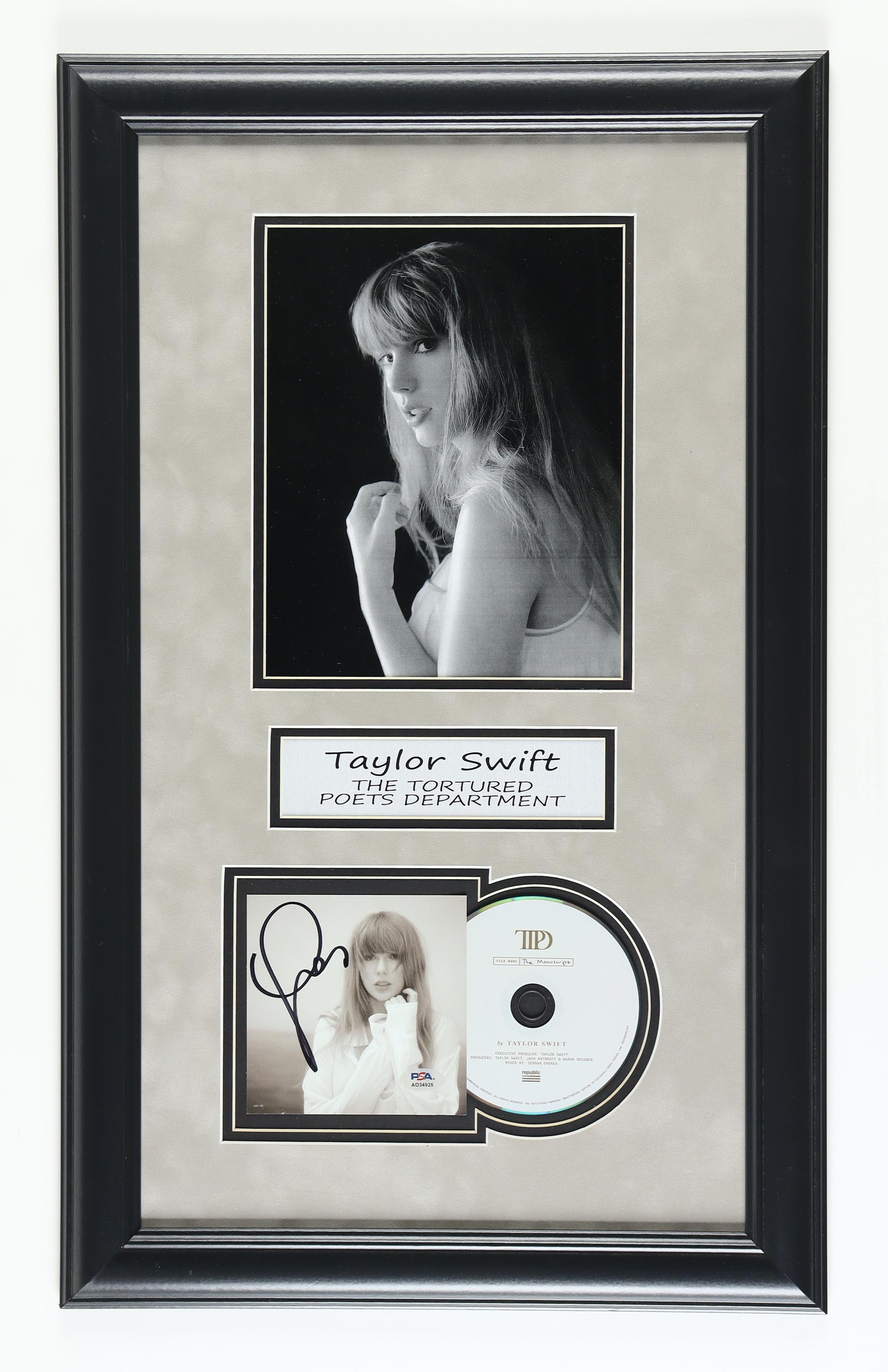 Custom frame measures approximately 16.5" x 27" in size. Features a "The Tortured Poets Department" CD insert that has been hand-signed by Taylor Swift. Includes disc as shown.