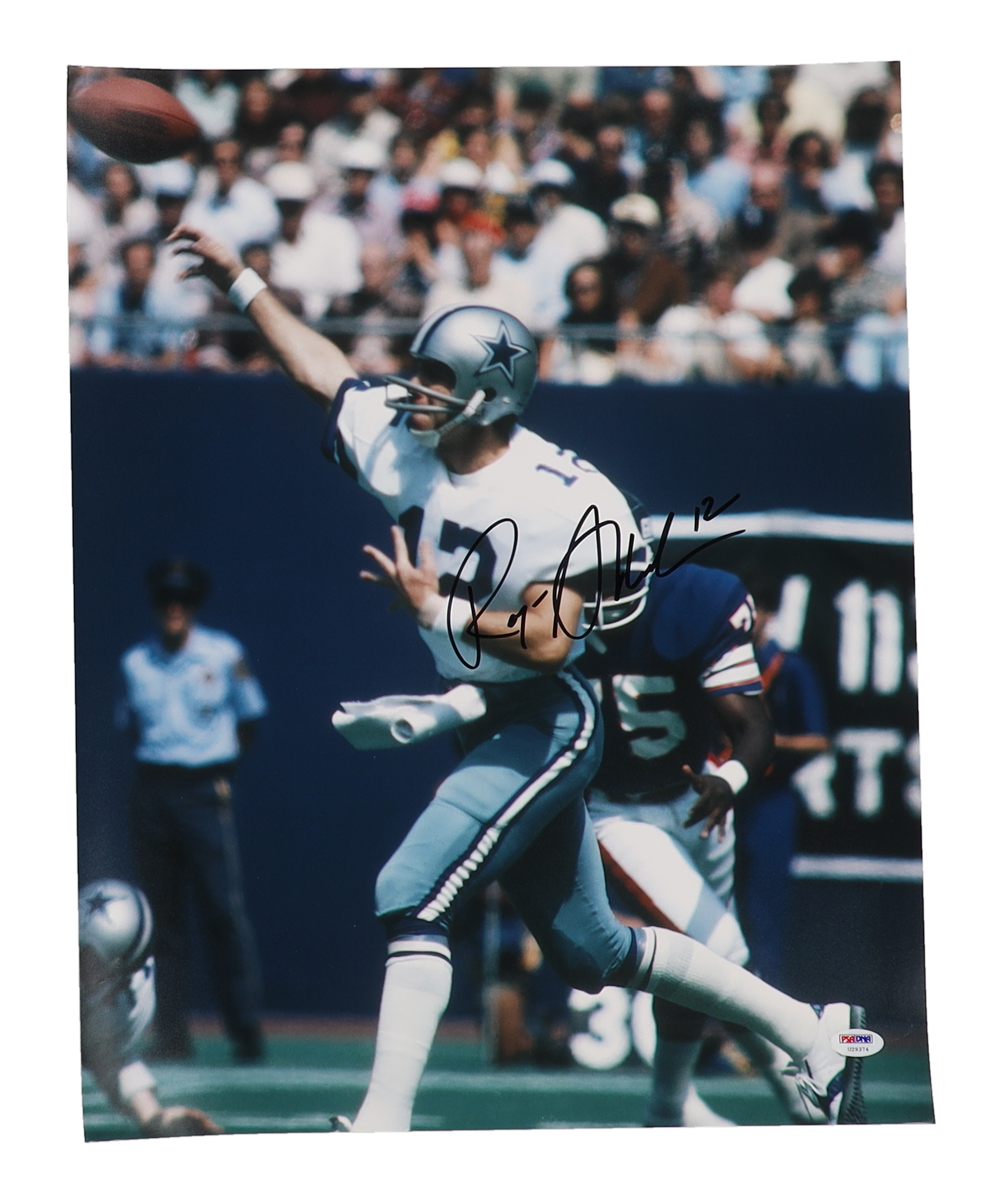 Photo measures 16" x 20" in size and has been hand-signed by Roger Staubach (Dallas Cowboys, HOF). Please note, there are creases throughout the photo.