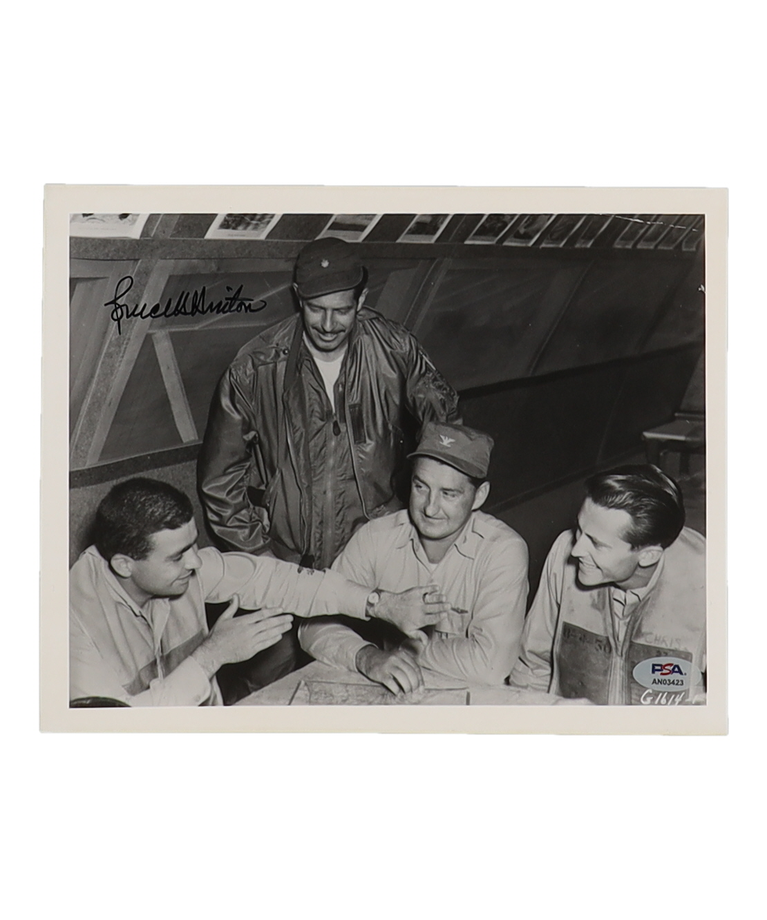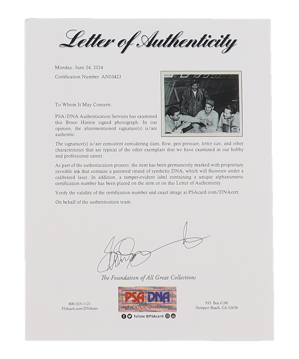 This 8x10 photograph is hand-signed by Lt. Col. Bruce Hinton, the commander of the 336th Fighter Interceptor Squadron of the 4th Fighter Interceptor Wing during the Korean War. Lt. Col. Hinton made history as the first F-86 Sabre pilot to score a MiG-15 kill, a significant achievement in the early days of jet-powered combat. This collectible comes authenticated by PSA/DNA and includes their Letter of Authenticity, ensuring the legitimacy and value of this extraordinary piece of military history.
