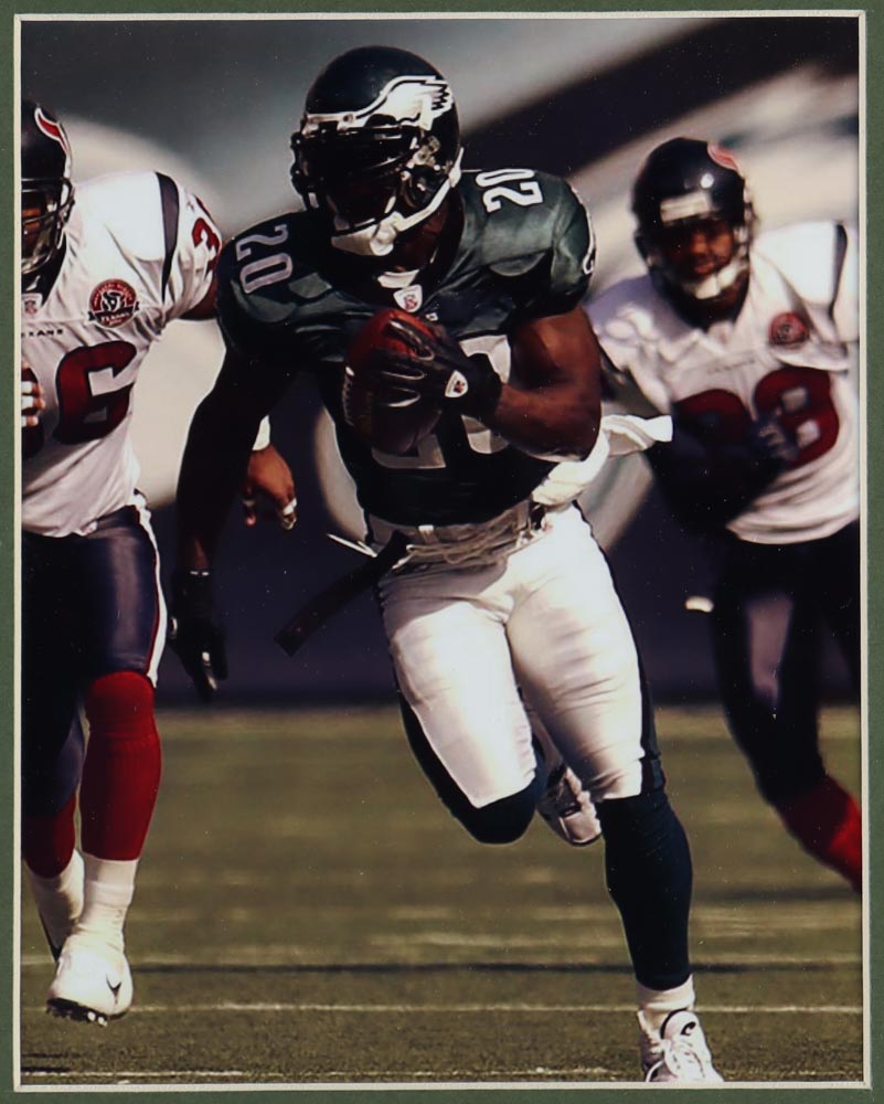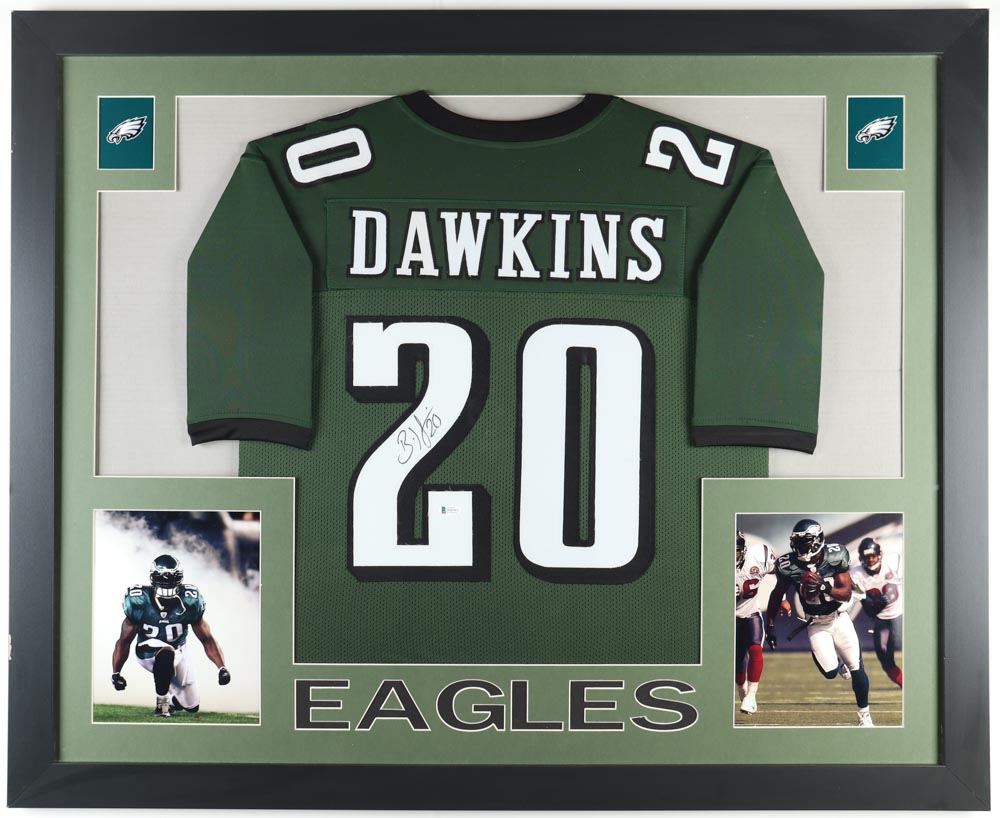 Custom frame measures approximately 35" x 43" in size and features a jersey that has been hand-signed by Brian Dawkins (HOF).