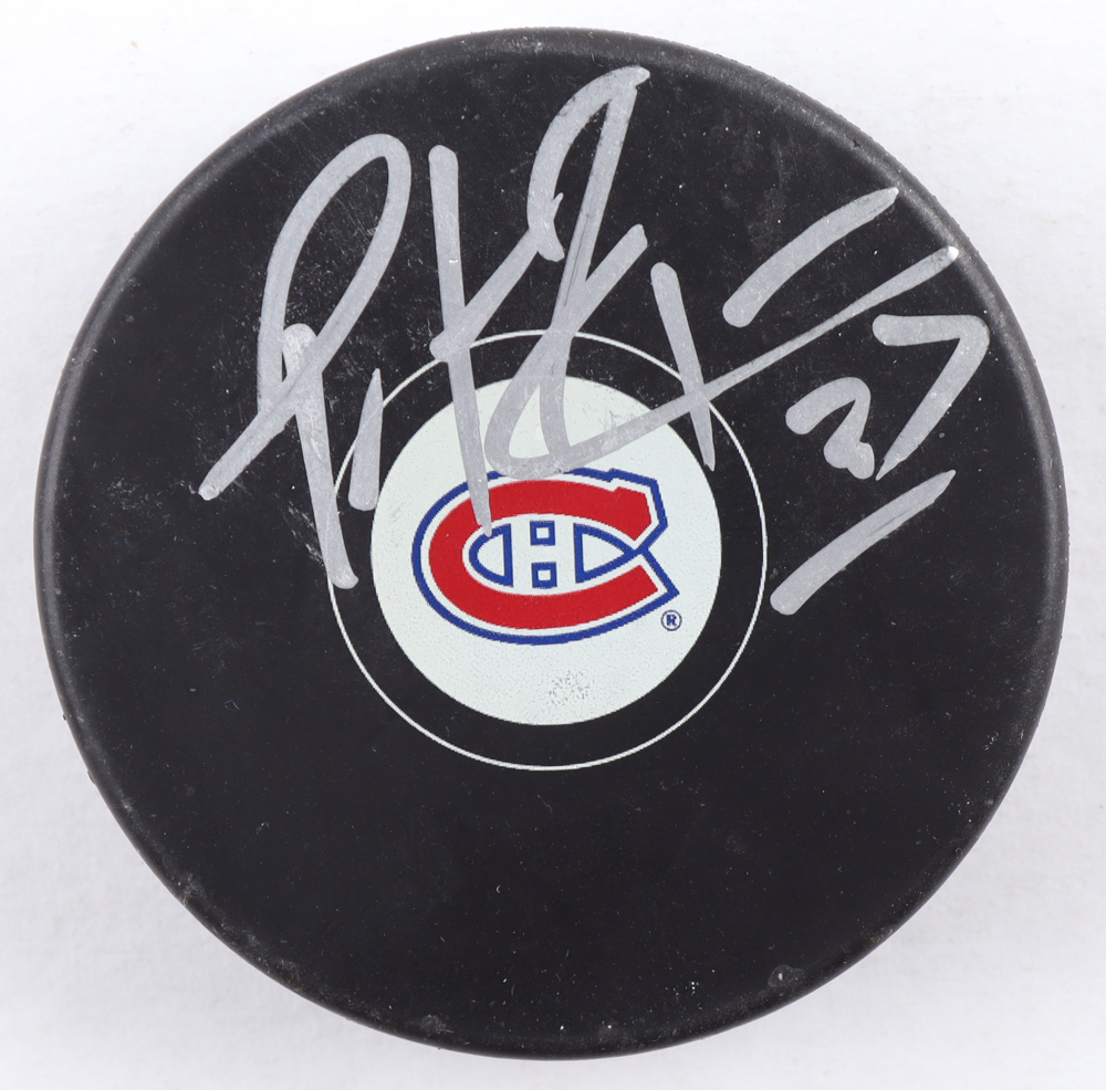 Montreal Canadiens logo hockey puck. Hand-signed by Patrick Roy.