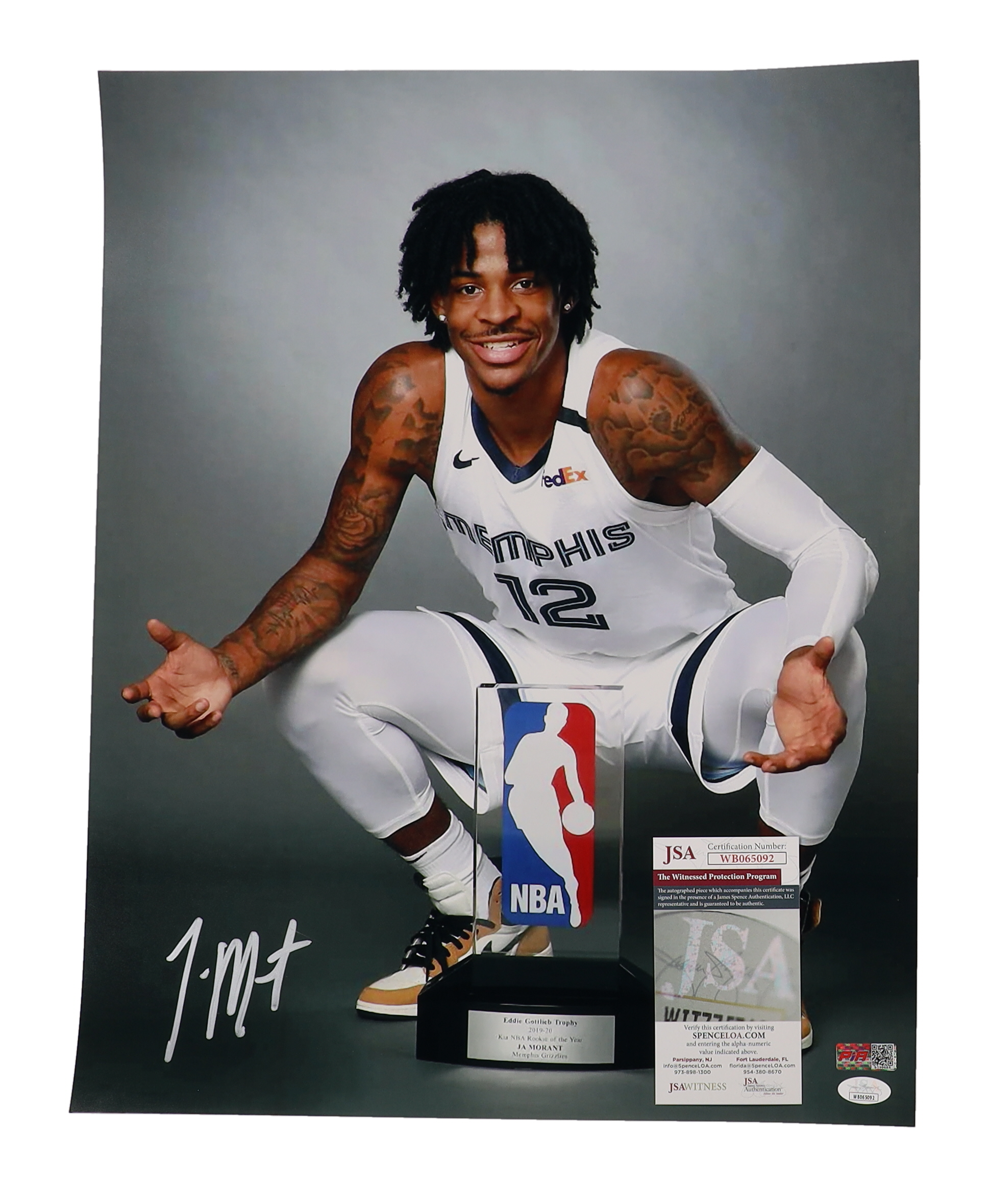 Photo measures 16” x 20” in size and has been hand-signed by Ja Morant (Memphis Grizzlies).
